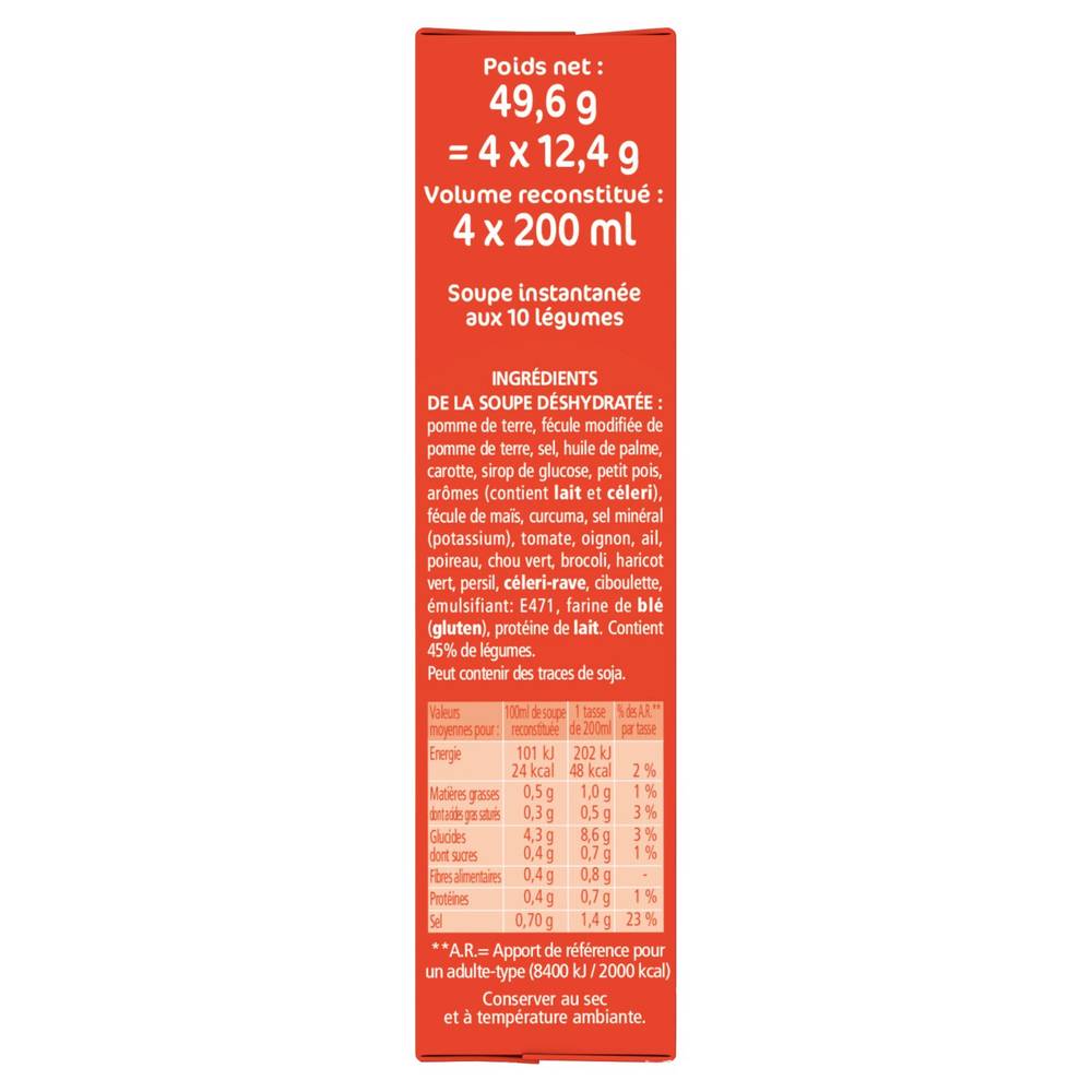 Ingrédients de la soupe déshydratée: pomme de terre,fécule modifiée de pomme de terre,sel,huile de palme,carotte,sirop de glucose,petit pois,arômes, contient LAIT et CÉLERI, ,fécule de maïs,curcuma,sel minéral, potassium, ,tomate,oignon,ail,poireau,chou vert,brocoli,haricot vert,persil,CÉLERI-RAVE,ciboulette,émulsifiant: E471,farine de BLÉ, GLUTEN, ,protéine de LAIT,Contient 45% de légumes, Peut contenir des traces de soja Contains: Orge et produits à base d'orge (contenant du gluten), céleri, céréales contenant du gluten, autre graines contenant du gluten et produits à base de ces graines contenant du gluten, lactose, lait, soja, blé
