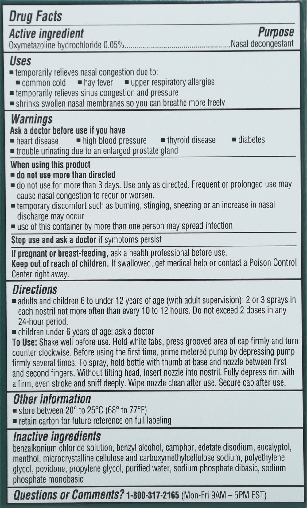 Ingredients: Active Ingredients: Oxymetazoline Hydrochloride (0.05 %), Nasal Decongestant. Inactive Ingredients: Benzalkonium Chloride Solution, Benzyl Alcohol, Camphor, Edatate Disodium, Eucalyptol, Menthol, Microcrystalline Cellulose and Carboxymethylcellulose Sodium, Polyethylene Glycol, Povidone, Propylene Glycol, Purified Water, Sodium Phosphate Dibasic, Sodium Phosphate Monobasic Additives: Benzalkonium Chloride Solution Benzyl Alcohol Camphor Edatate Disodium Eucalyptol, Menthol Microcrystalline Cellulose and Carboxymethylcellulose Sodium, Polyethylene Glycol Povidone Propylene Glycol Purified Water, Sodium Phosphate Dibasic Sodium Phosphate Monobasic.