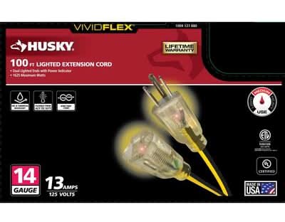 Husky Vividflex 14/3 Gauge Duty Indoor/Outdoor Lighted Extension Cord, M- 100 ft, Yellow