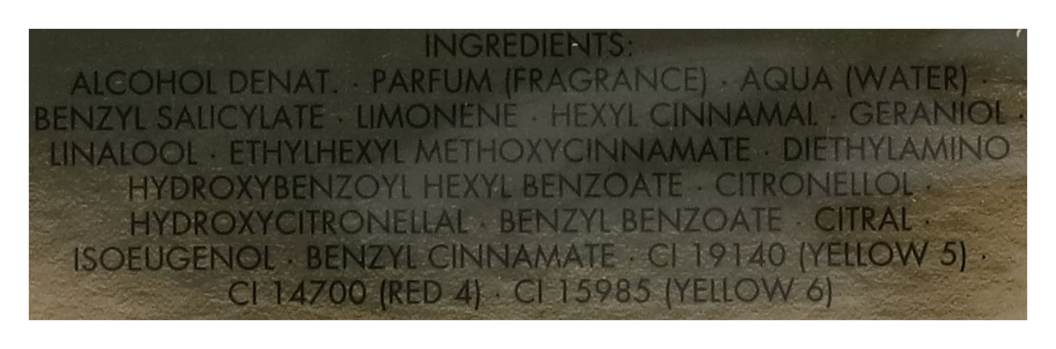 Ingredients: Alcohol, Parfum (Fragrance), Aqua (Water), Benzyl Salicylate, Limonene, Hexyl Cinnamal, Geraniol, Linalool, Ethylhexyl Methoxycinnamate, Diethylamino Hydroxybenzoyl Hexyl Benzoate, Citronellol, Hydroxycitronellal, Benzyl Benzoate, Citral, Isoeugenol, Benzyl Cinnamate, Bht, Ci 15985 (Yellow 6), Ci 14700 (Red 4), Ci 19140 (Yellow 5). This ingredient list is updated regularly. Always read the ingredients listed on the packaging to ensure they are suitable for your personal use.