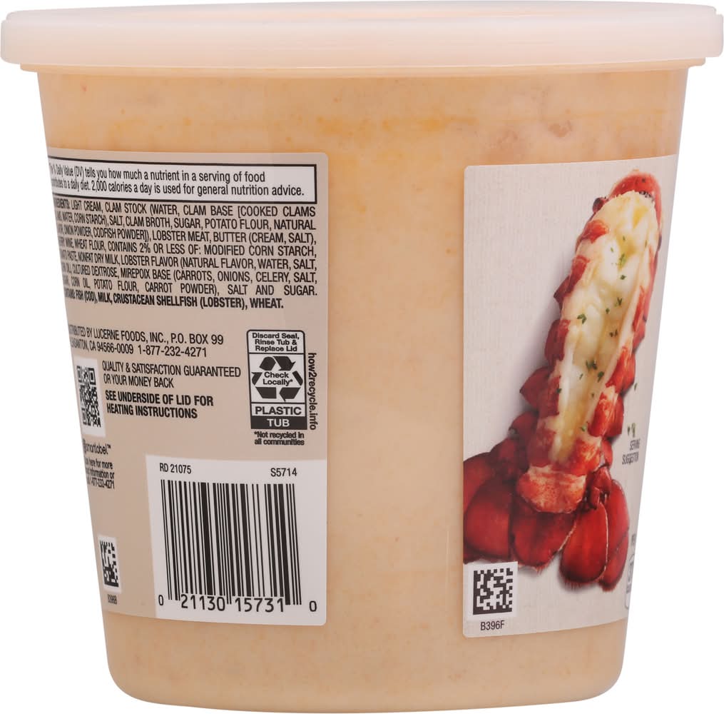 Light Cream, Clam Stock (Water, Clam Base [Cooked Clams {Clams, Water, Corn Starch}, Salt, Clam Broth, Sugar, Potato Flour, Natural Flavor, Onion Powder, Codfish Powder]), Lobster Meat, Butter (Cream, Salt), Sherry Wine, Wheat Flour, Contains 2% or Less of: Modified Corn Starch, Tomato Paste, Nonfat Dry Milk, Lobster Flavor (Natural Flavor, Water, Salt, Corn Oil), Cultured Dextrose, Mirepoix Base (Carrots, Onions, Celery, Salt, Sugar, Corn Oil, Potato Flour, Carrot Powder), Salt and Sugar. Contains: Fish, Milk, Crustacean Shellfish, Wheat