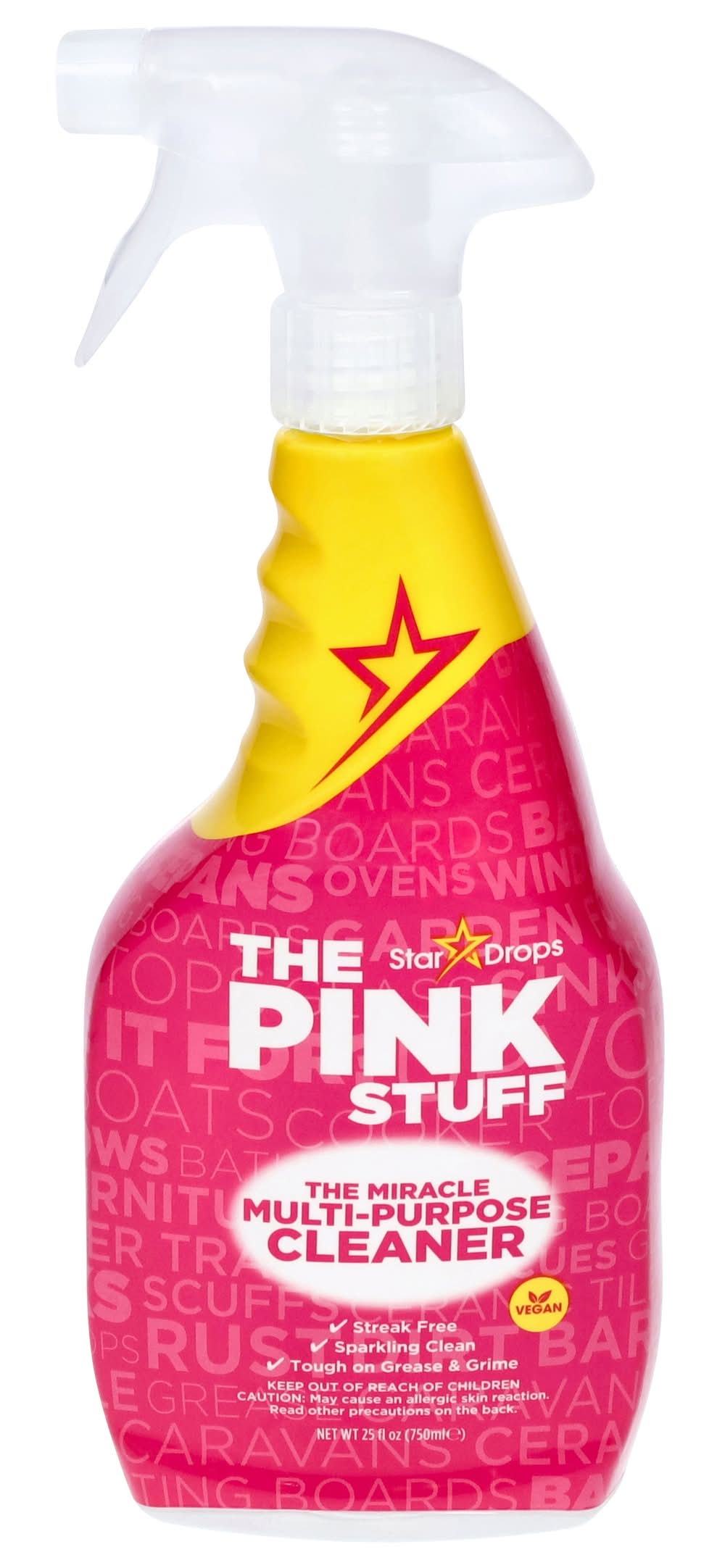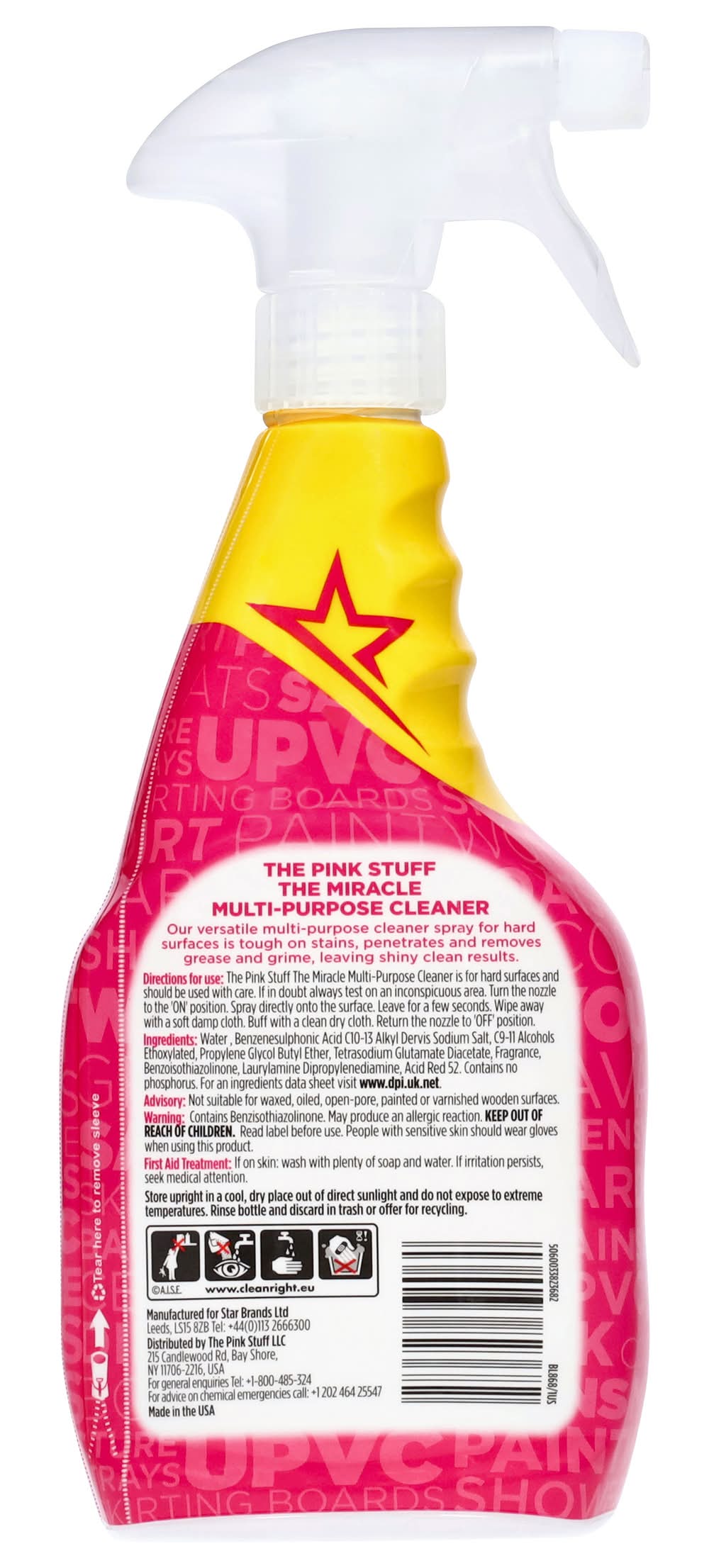 The Pink Stuff Miracle multipurpose cleaner is a versatile multipurpose spray cleaner for hard surfaces. This spray is popular with customers as it is tough on stains, removing grease and grime with ease. Every surface cleaned with the Miracle multipurpose cleaner is left shiny and clean. - Versatile multipurpose cleaner for hard surfaces in a spray bottle - Capacity: 25.4 fl. oz. - Effective against grease and grime, leaving sparkling, streak-free shine - Ingredients: propylene glycol, anionic surfactant, nonionic surfactant, colorant, fragrance, preservative, amino polycarboxylate - Product is Vegan - Safety Data Sheet Packaging: Reusable