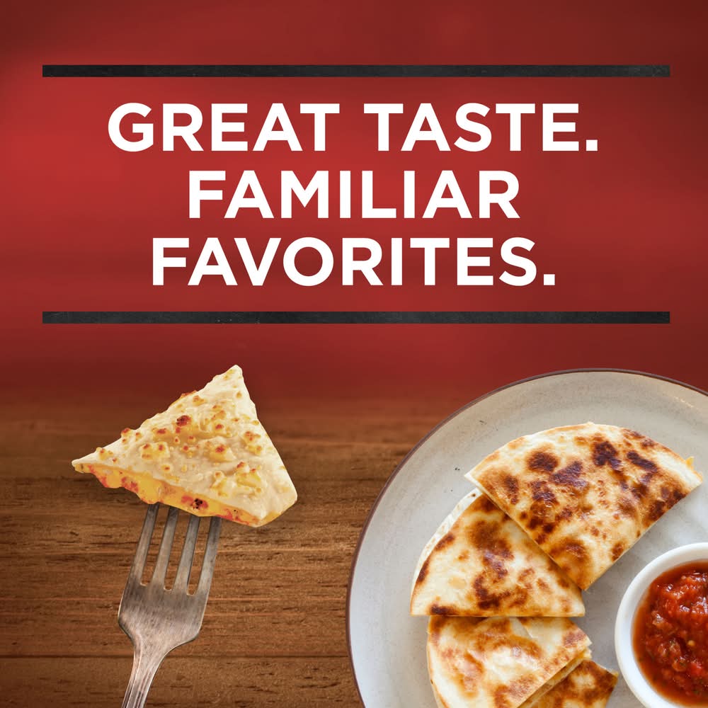 Directions for use: Conventional Oven: 1. Preheat oven to 400 degrees F. 2. Place single layer of quesadillas on baking sheet. 3. Bake in center of oven 14 to 15 minutes. Handle carefully, they’re hot! Serve and enjoy! Microwave Oven: For best results, conventional oven is recommended. 1. Place 2 quesadillas on a microwave-safe plate. 2. Microwave on high 1 minute to 1 minute 30 seconds. 3. Check that food is cooked thoroughly. Handle carefully; they’re hot! Let stand 1 minute; enjoy! Must be cooked thoroughly. For food safety and quality: Keep frozen; do not thaw; Microwave directions developed with 1100-watt microwave ovens. Appliances vary. Adjust cooking times as needed. Food must be cooked thoroughly to 165 degrees F. Read and follow these cooking directions. Keep frozen. Storage recommendation: Keep frozen.