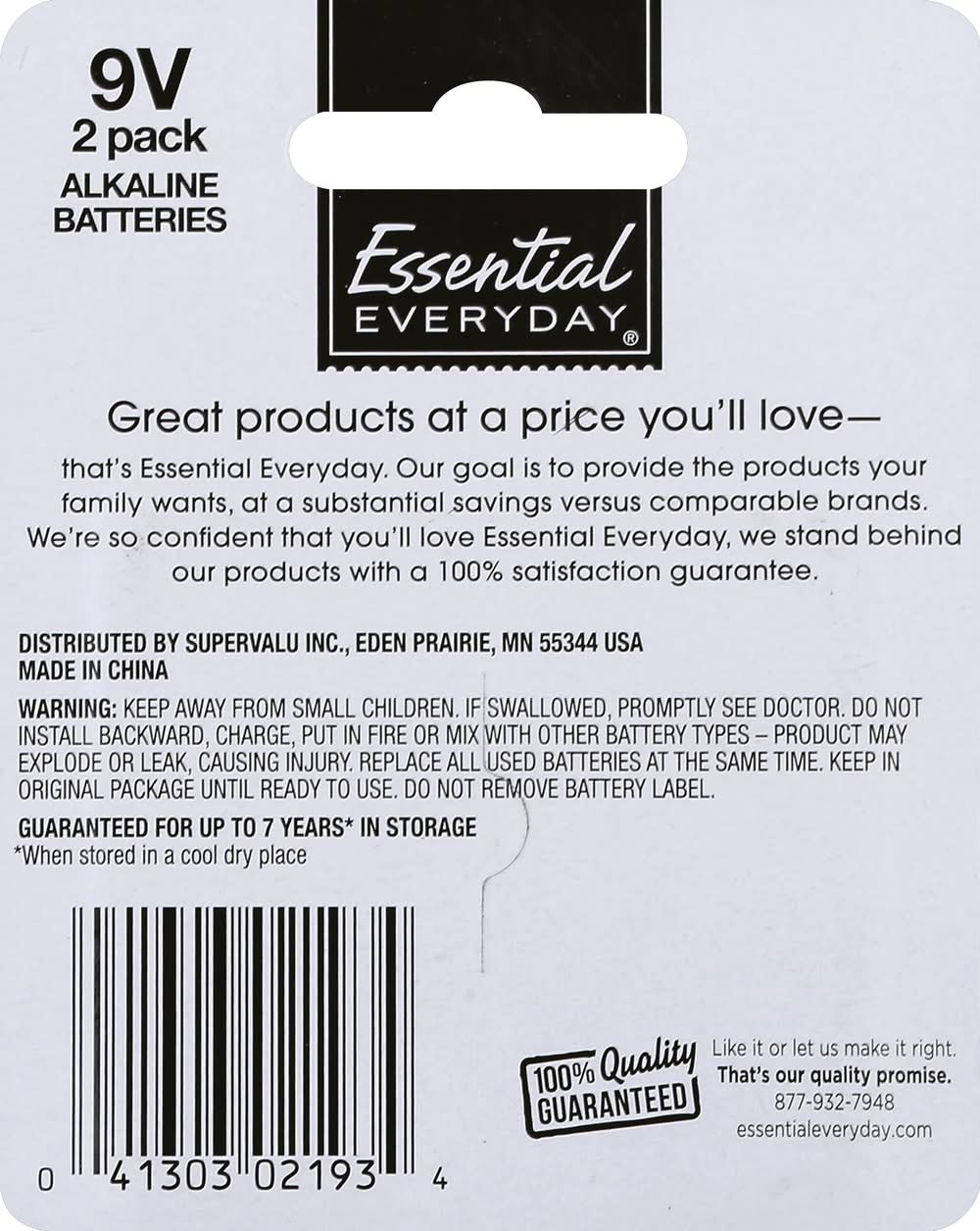 Your Essential Everyday 9V Ultimate Long Lasting Alkaline Batteries delivery options may vary depending on where you are in a city. Enter your address to browse Essential Everyday 9V Ultimate Long Lasting Alkaline Batteries delivery options near you.