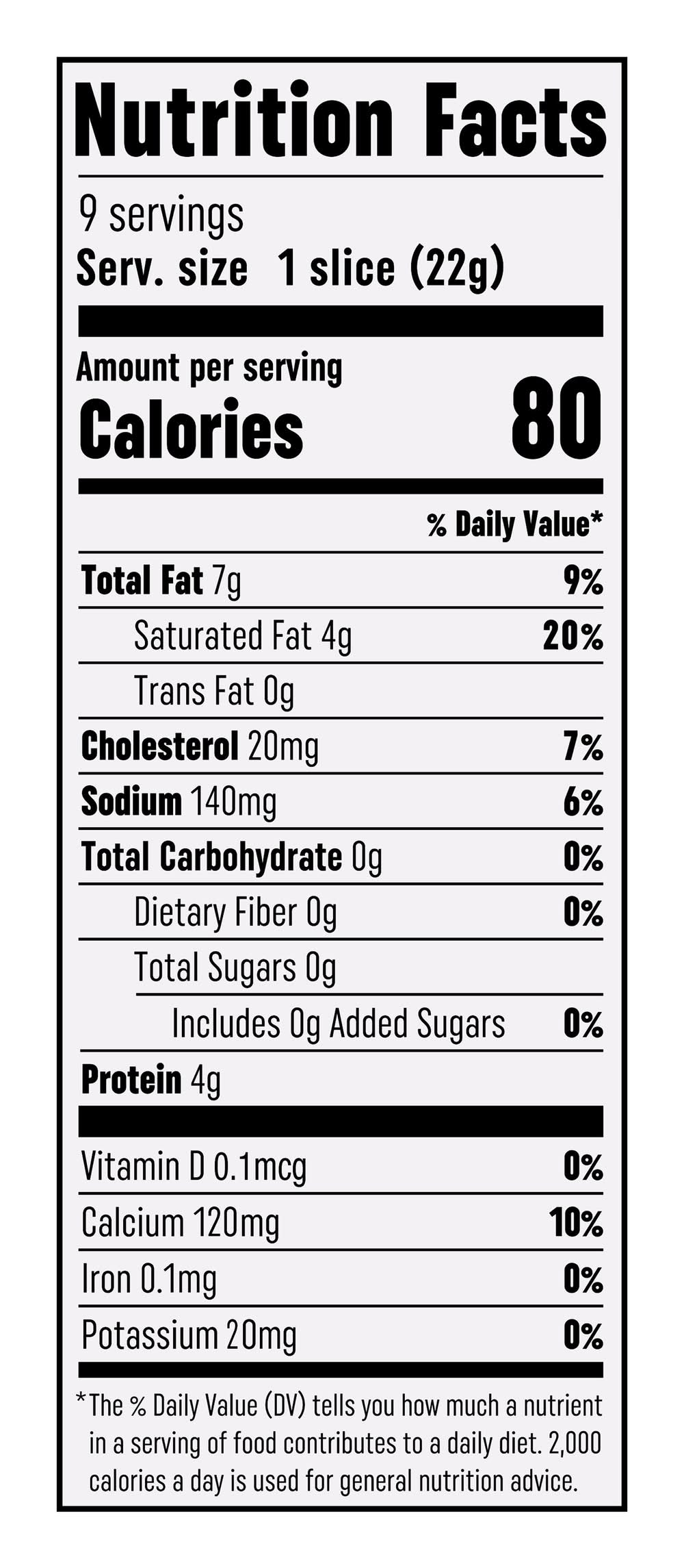 Fresh pasteurized milk, cheese cultures, salt, enzymes, annatto (for color)