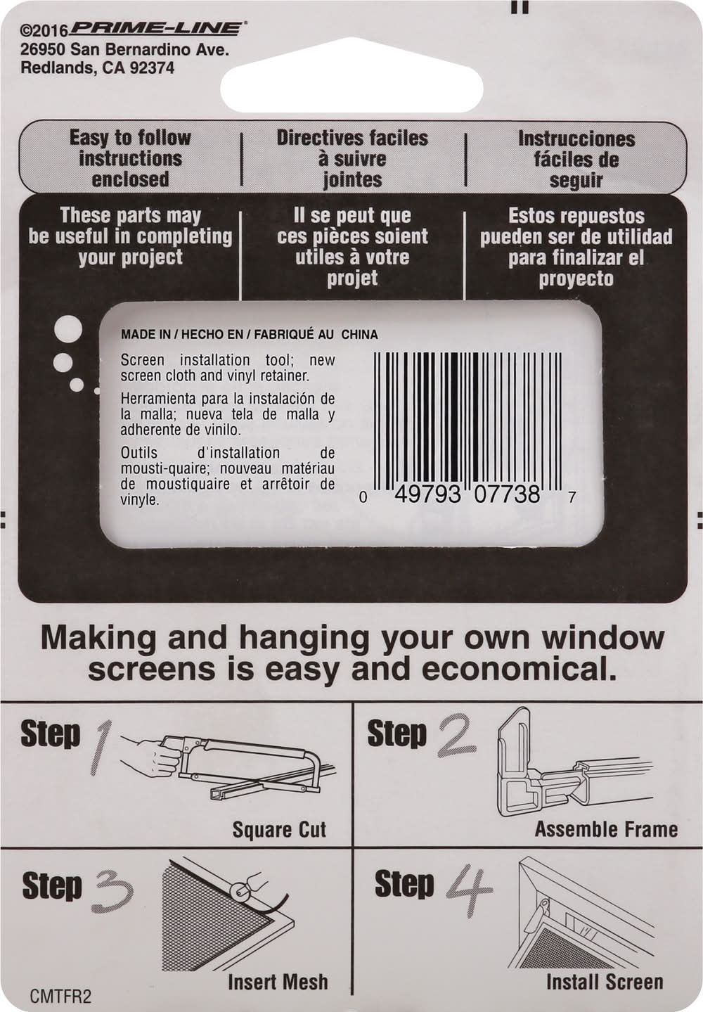 Directions: Step 1: Square cut. Step 2: Assemble frame. Step 3: Insert mesh. Step 4: Install screen.
