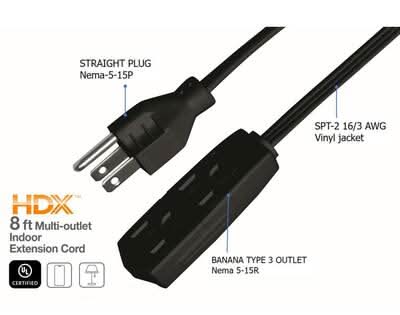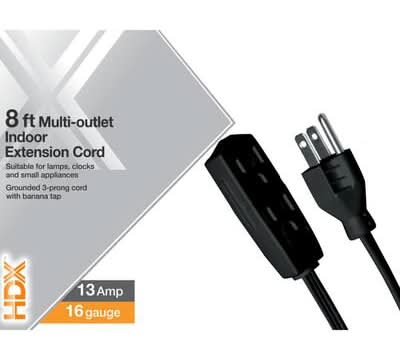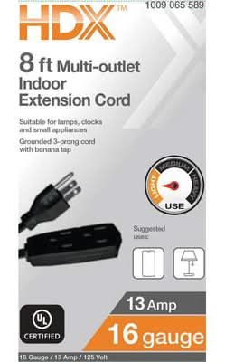 This HDX 8 ft. 16/3 Indoor Multi-Outlet Extension Cord is great for indoor use in a home office or other living space. The medium length extension cord is convenient for providing power to indoor holiday lights and small appliances. It is designed with 3 grounded outlets and a molded-on 3-prong bana This product can expose use to chemicals including lead which is known to the State of California to cause cancer and birth defects or other reproductive harm. For more information go to www.P65warnings.ca.gov. • Color: Black • Size: 8 Ft
