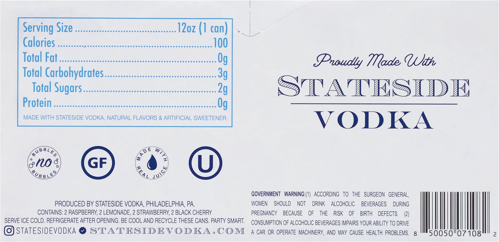 Ingredients: Raspberry: Made with Stateside Vodka, Natural Flavors & Artificial Sweetener. Lemonade: Made with Stateside Vodka, Natural Flavors & Artificial Sweetener. Strawberry: Made with Stateside Vodka, Natural Flavors & Artificial Sweetener. Black Cherry: Made with Stateside Vodka, Natural Flavors & Artificial Sweetener.