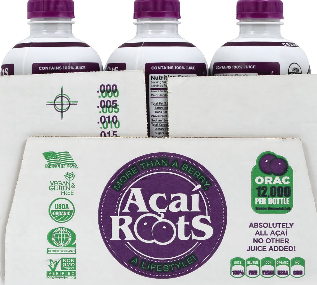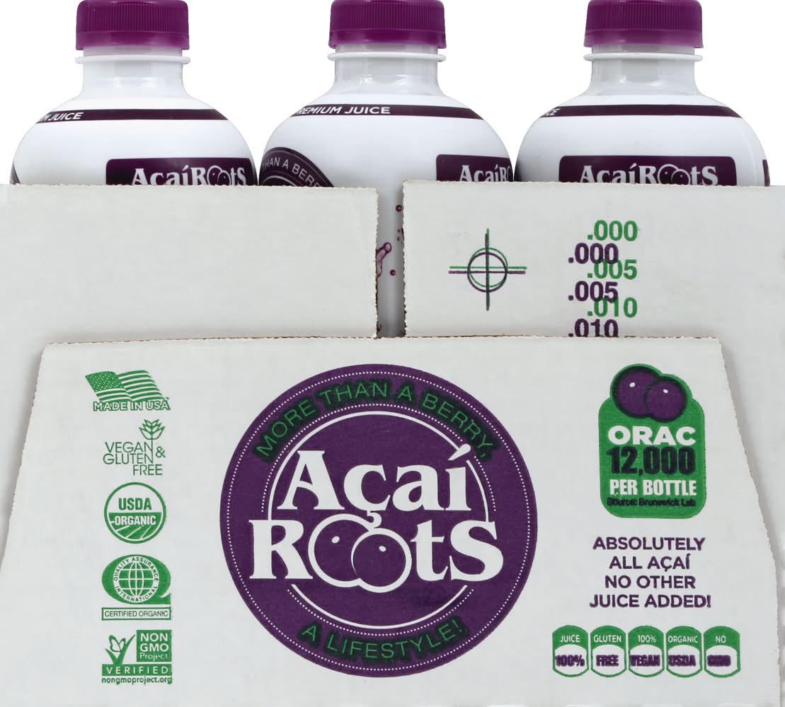 USDA Organic. Vegan & gluten free. Certified organic by Quality Assurance International. Non GMO Project verified. Nongmoproject.org. No GMO. 12,000 ORAC per bottle. Source: Brunswick Lab. More than a berry, a lifestyle! Absolutely all Acai no other juice added! 100% juice. 100% vegan. Made in USA. Acai Roots,