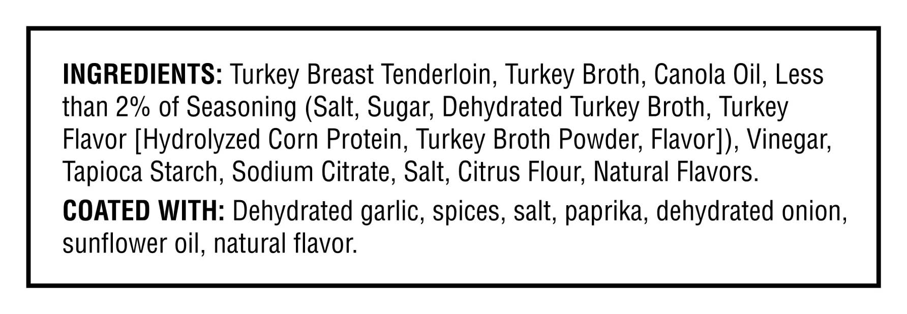 Ingredients: Turkey Breast, Turkey Broth, Canola Oil, Contains Less Than 2% of Seasoning (Salt, Sugar, Dehydrated Turkey Broth, Turkey Flavor [Hydrolyzed Corn Protein, Turkey Broth Powder, Flavor]), Vinegar, Tapioca Starch, Sodium Citrate, Salt, Citrus Flour, Natural Flavors. Coated With: Dehydrated Garlic, Spices, Salt, Paprika, Dehydrated Onion, Sunflower Oil, Natural Flavor. Contains: Free From: AC -- Crustaceans and Their Derivatives, AE -- Eggs and Their Derivatives, AF -- Fish and Their Derivatives, AM -- Milk and its Derivatives, AN -- Tree Nuts and Their Derivatives, AP -- Peanuts and Their Derivatives, AS -- Sesame Seeds and Their Derivatives, AY -- Soybean and its Derivatives, UW -- Wheat and Their Derivatives