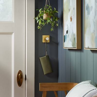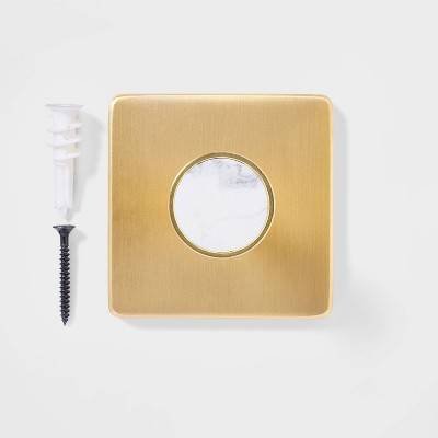 Add a touch of glam style and shine to your wall storage with this Metal and Faux Marble Hook from Threshold. Whether you use the stylish wall hook in your living room, bedroom or bathroom, it will stand out thanks to its unique design, which includes a single gold-tone metal peg with a rounded faux-marble top in white and a square base with a complementary brass finish. The space-saving design provides a decorative storage solution for hanging towels, coats, scarves, belts and more.
