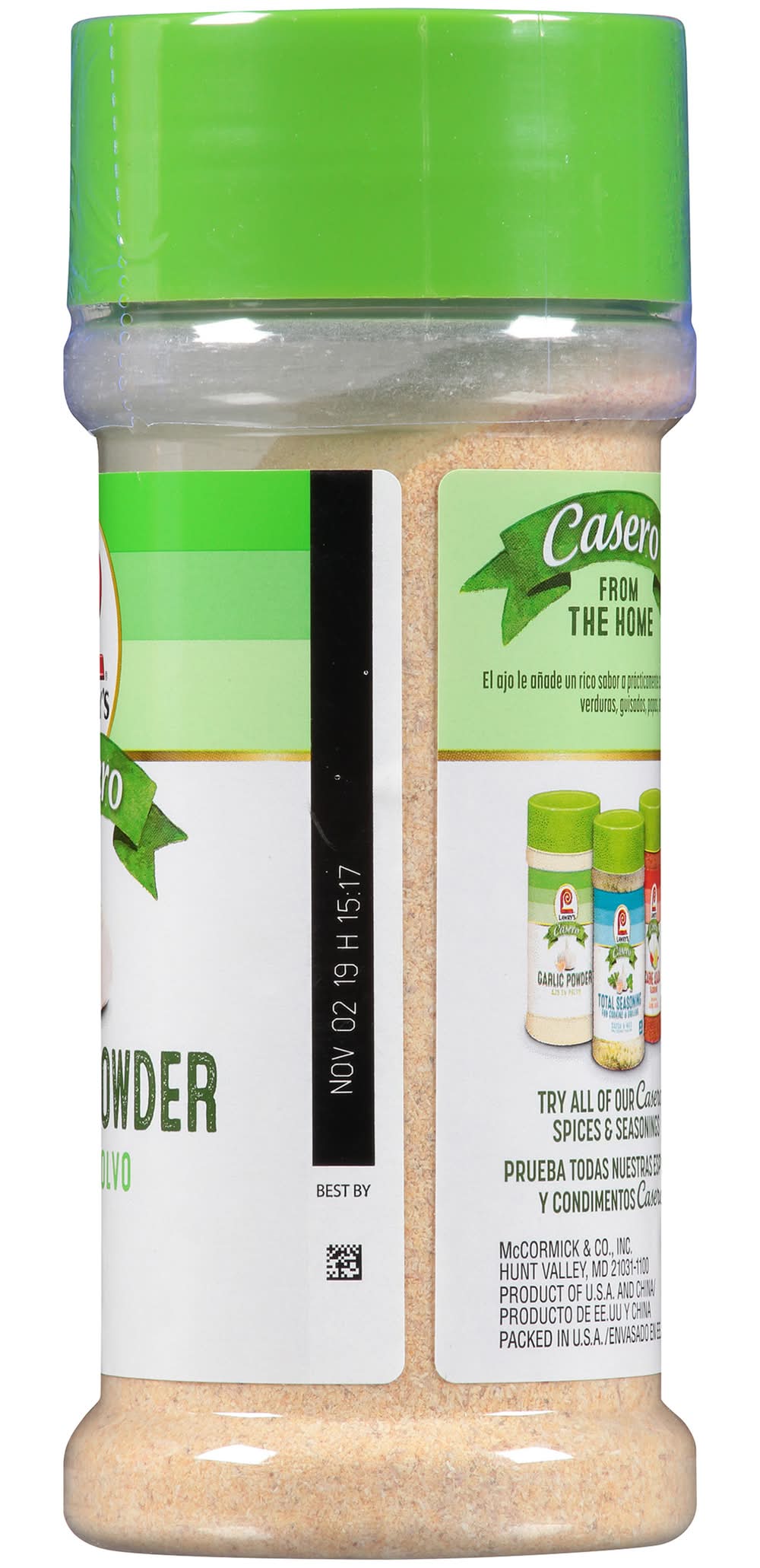 Lawry's Casero Garlic Powder comes in an 8.5 oz container and features a blend of garlic seasoning. It is produced with ingredients sourced from the U.S.A. and China, with the final product packed in the U.S.A. This garlic powder is suitable for adding flavor to a variety of recipes. • Size: 8.5 oz • McCormick & Co., Inc., Hunt valley, MD, 21031-1100, Ph: 800-9LAWRYS