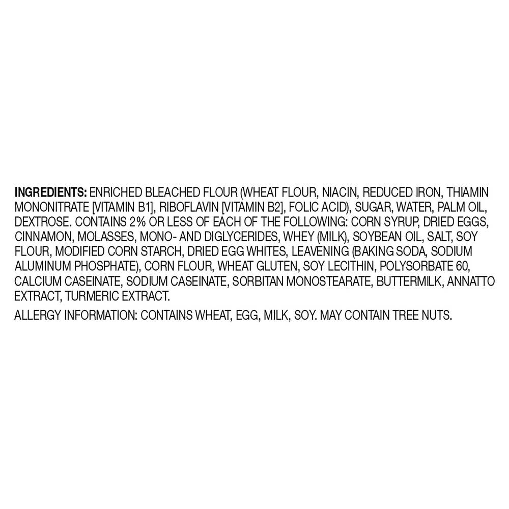 Enriched Bleached Flour (Wheat Flour, Niacin, Reduced Iron, Thiamin Mononitrate [Vitamin B1], Riboflavin [Vitamin B2], Folic Acid), Sugar, Water, Palm Oil, Dextrose. Contains 2% or less of each of the following: Corn Syrup, Dried Eggs, Cinnamon, Molasses, Mono- and Diglycerides, Whey (Milk), Soybean Oil, Salt, Soy Flour, Modified Corn Starch, Dried Egg Whites, Leavening (Baking Soda, Sodium Aluminum Phosphate), Corn Flour, Wheat Gluten, Soy Lecithin, Polysorbate 60, Calcium Caseinate, Sodium Caseinate, Sorbitan Monostearate, Buttermilk, Annatto Extract, Turmeric Extract Contains: Wheat, Eggs, Milk, Soybeans, Corn, Gluten, Tree Nuts