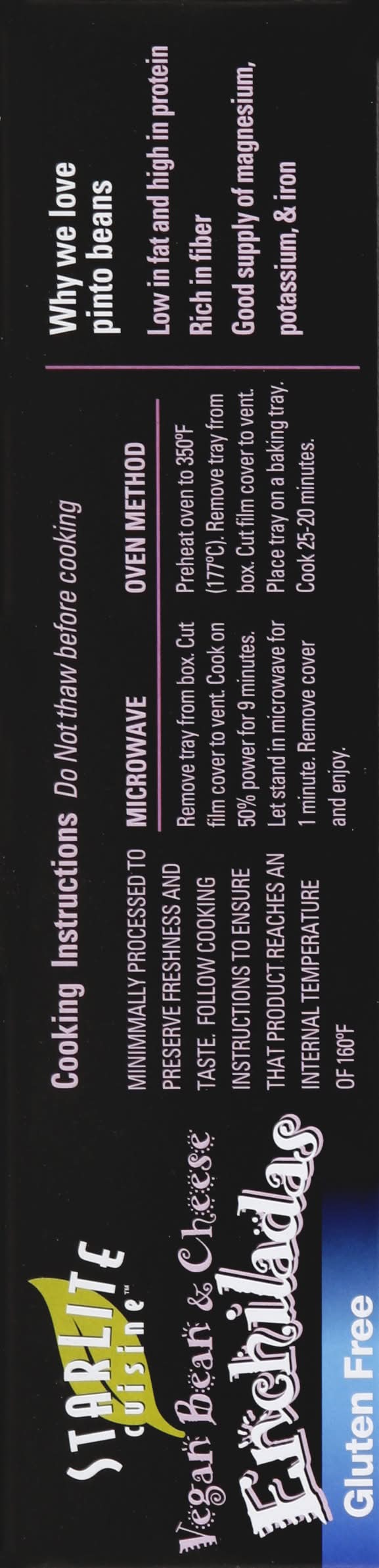 Bean & cheese. No trans fat. No GMO. No cholesterol. Non-dairy. All natural white corn tortillas filled with creamy pinto beans and vegan cheese topped with traditional red sauce, sprinkled with vegan cheese. Gluten free. Vegan. 9 g fiber. 8 g protein. Why we love pea protein. Low in fat and high in protein. Rich in fiber. Good supply of magnesium, potassium & iron. At StarLite Cuisine, we care about what we put in our mouths - yours, too. That's why we create all our products from scratch. We don't have food engineers or global taste panels. Product ideas sprout from the lunchroom, and we work hard to make nutritious products that also taste fantastic. - June. Join us on Facebook and Twitter or www.starlitecuisine.com. Made from 100% recycled paper. Made in USA. STARLITE CUISINE,