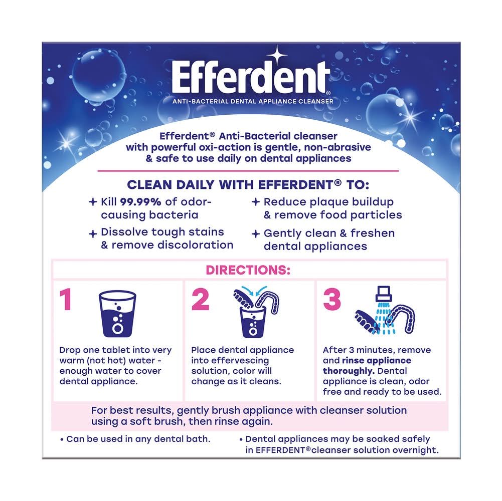 4 more tablets! No. 1 dentist recommended. Kills 99.9% of odor causing bacteria. American Dental Association: ADA Accepted. Clean With Efferdent Antibacterial Denture Cleanser at Least Once a Day To: Kill 99.9% of the germs that cause denture odor; Dissolve tough stains in hard-to-reach places, even in between teeth; Reduce plaque buildup and remove food particles that can cause gum irritation; Keep dentures extra fresh and clean. Can be used in any denture bath. Dentures may be soaked safely in Efferdent denture cleanser overnight. Recommended for use on full or partial dentures. Discover which is right for you: Efferdent fresh, minty clean; Efferdent overnight deep clean; Efferdent our fastest, most powerful clean. . Made in the USA. Medtech Products Inc., Tarrytown, NY 10591,877-925-5374
