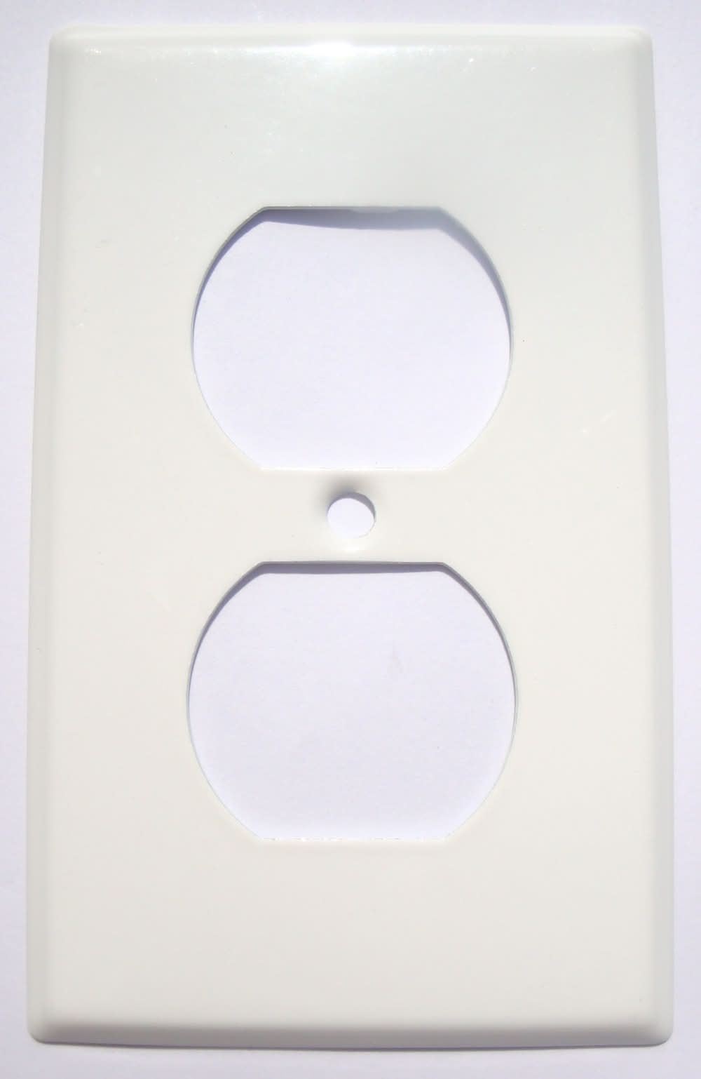 Covers a duplex receptacle. This line is available in a wide range of openings. High quality steel with a durable powder coating. Glossy white enamel finish. Standard shape with bevel edge. Can be painted or wallpapered over. Made in USA. Use Location: Indoor Color: White