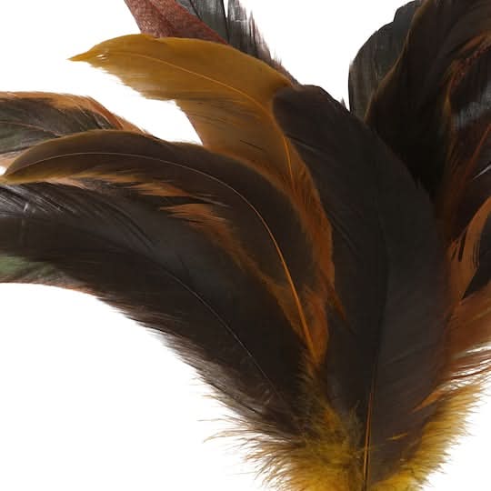 This gold pheasant feather pick is perfect for adding a unique touch to your seasonal floral arrangement. Natural product; colour and size may vary. Pheasant feather, cock feather, and iron wire. Recommended for indoor use