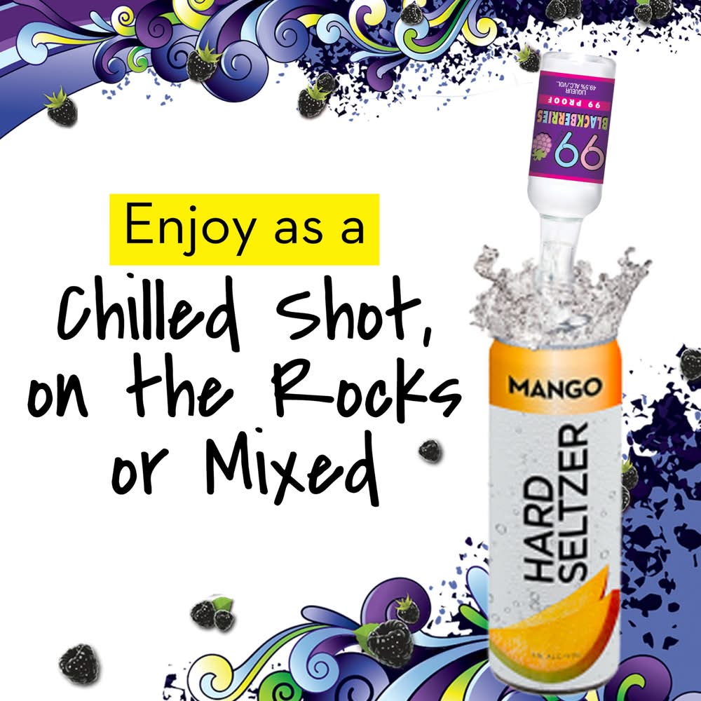 Liven up your experience with the exciting flavor of 99 Brand Blackberry Liqueur. With 27 cordials flavors and growing, 99 is America's #1 cordials brand. These liqueur shots are an amazing way to celebrate the good times and chill vibes. Each bottle of 99 Brand Blackberry liqueur drinks has zero sugar and 155 calories per 1.5 ounce shot. At 49.5% alcohol, 99 can be enjoyed straight out of the bottle as shots for a burst of tasty blackberry flavor. Perfect for any party or celebration with friends, 99 Blackberries tastes great in a multitude of spectacular alcoholic beverages, cocktails and mixed drinks. Add a splash to your seltzer for a full flavor explosion or combine this blackberry liqueur shot with other 99 Brand liqueurs, like 99 Apples, to make a variety of delicious alcoholic beverages. Store 99 Blackberries at room temperature or pour it from your freezer for an icy shot. Live life in color with 99 Brand Liqueur. Please drink responsibly. Alcohol by volume: 49.5%