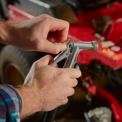 The Anvil Metal Cleaning Nozzle features a squeeze handle and a trigger lock. The threaded tip end allows for connection to your hose with a 5/8 in. fitting. The durable metal body stands up to tough environments. Cancer and Reproductive Harm - www.p65warnings.ca.gov