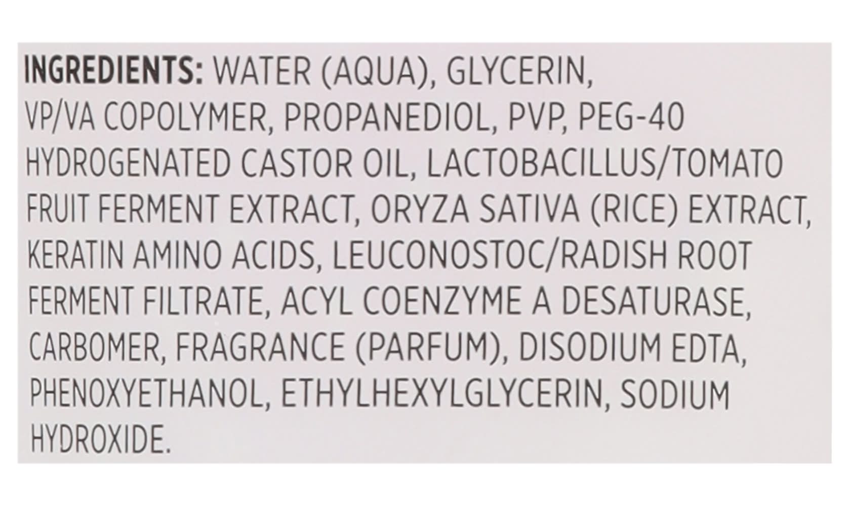 Ingredients: Water (Aqua), Glycerin, VP/VA Copolymer, Propanediol, PVP, PEG-40 Hydrogenated Castor Oil, Lactobacillus/Tomato Fruit Ferment Extract, Oryza Sativa (Rice) Extract, Keratin Amino Acids, Leuconostoc/Radish Root Ferment Filtrate, Acyl Coenzyme a Desaturase, Carbomer, Fragrance (Parfum), Disodium EDTA, Phenoxyethanol, Ethylhexylglycerin, Sodium Hydroxide