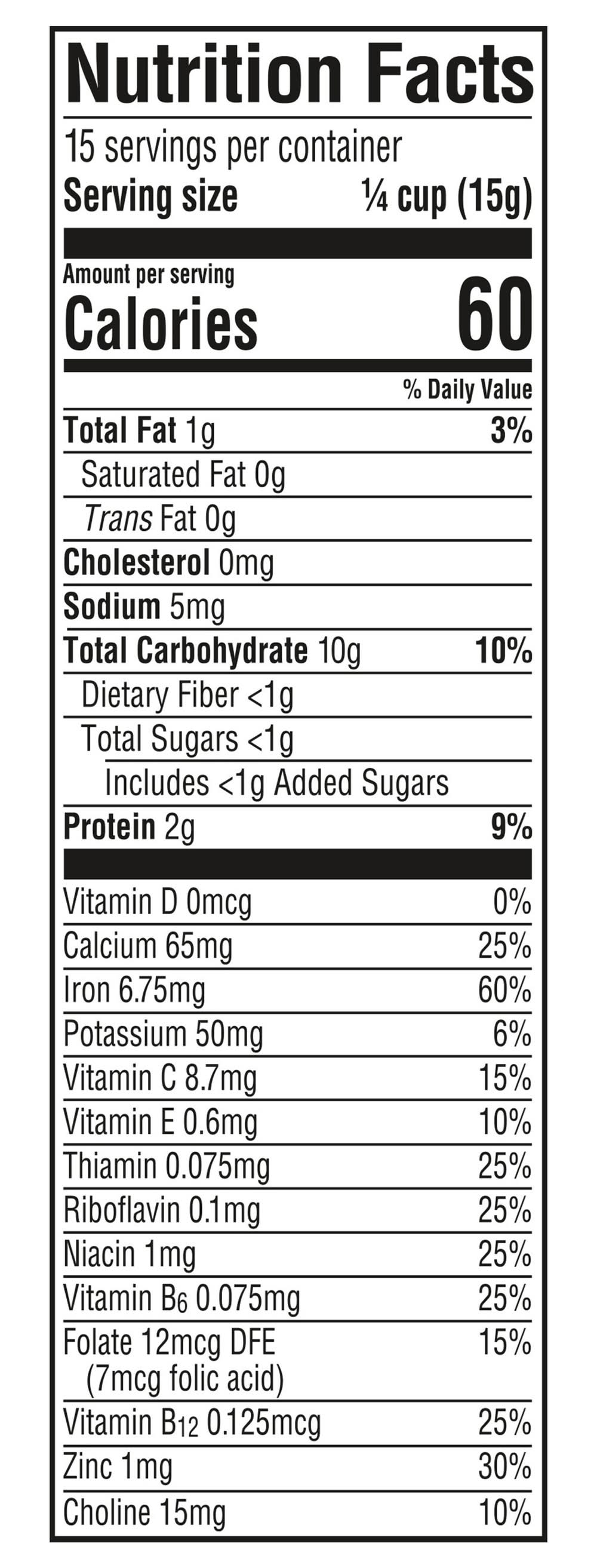 Ingredients: Organic Whole Grain Oat Flour (Contains Wheat), Vitamins and Minerals: Calcium Carbonate, Choline Bitartrate, Vitamin C (Ascorbic Acid), Iron (Electrolytic), Zinc Sulfate, Vitamin E (Alpha Tocopheryl Acetate), Niacinamide, Vitamin B2 (Riboflavin), Vitamin B1 (Thiamin Mononitrate), Vitamin B6 (Pyridoxine Hydrochloride), Folic Acid, Vitamin B12 Contains: Wheat, Oat