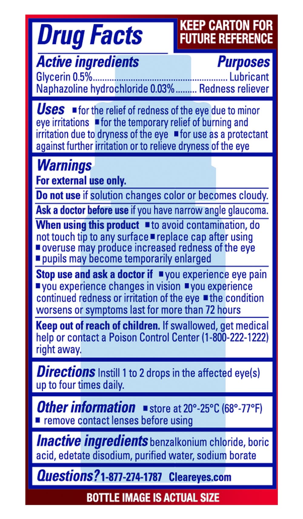 Ingredients: Glycerin (0.5 %), Lubricant; Naphazoline Hydrochloride (0.03 %), Redness reliever.Benzalkonium Chloride, Boric Acid, Edetate Disodium, Purified Water, Sodium Borate. Additives: Inactive Ingredients: Benzalkonium Chloride, Boric Acid, Edetate Disodium, Purified Water, Sodium Chloride., Sodium Chloride