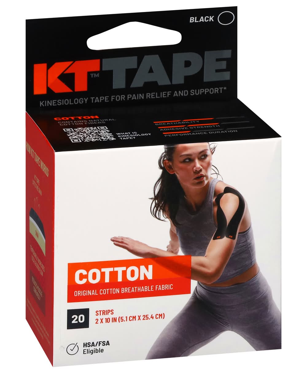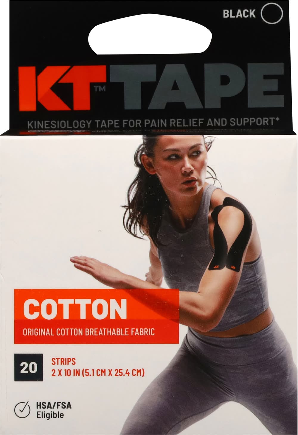 Featuring a second-skin adhesive and all-natural cotton construction the KT Tape® Cotton Tape targets sore muscles to provide support, relief and recovery.Kinesiology Tape Elastic sports and fitness tape designed for muscle, ligament and tendon pain relief and support Support and Comfort UltraLite elastic core for enhanced support Comfortable to wear for 1-3 days Latex-free construction helps avoid skin irritation Made to Last Secondskin adhesive for use in extreme conditions Pre-cut strips for easy handling Stays on in water Additional Details 20 10’’ pre-cut strips per roll Includes step-by-step instructions for applying. Sports Medicine Color: Black