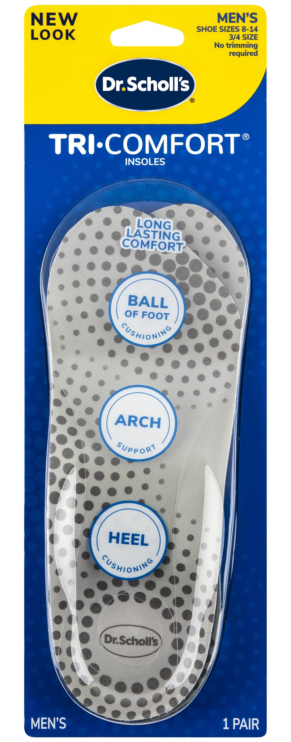 Dr. Scholl's Tri-Comfort Insoles are crafted to enhance comfort in three key areas of the foot: the heel, arch, and ball. Specifically designed for men's shoes, these insoles support efforts to improve mobility and alleviate foot fatigue, discomfort, and pain, aligning with the brand's long-standing commitment to fostering active and healthier lifestyles. Each package includes one pair of insoles. • Size: M 8-12 • male • Scholl's Wellness Company LLC, Parsippany,NJ,07054
