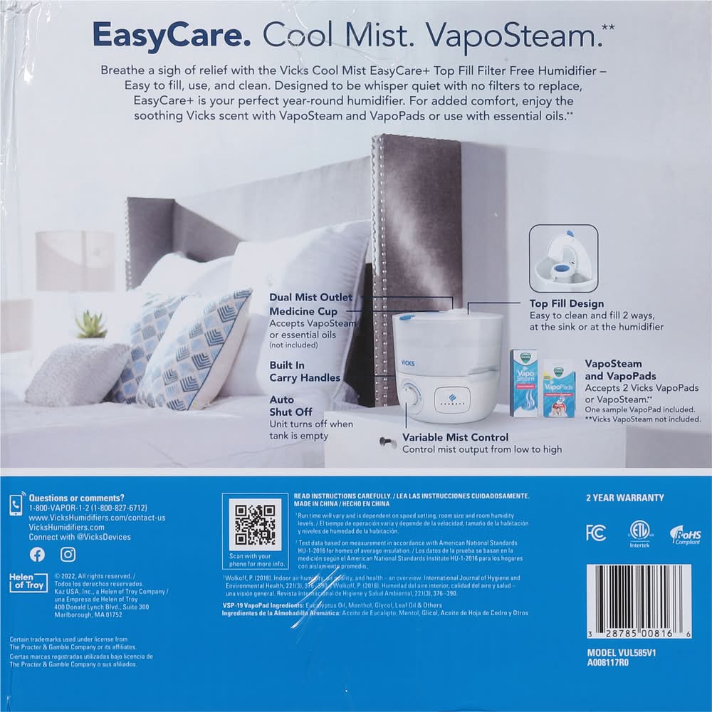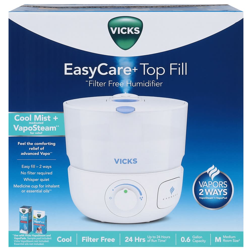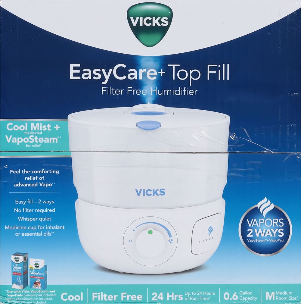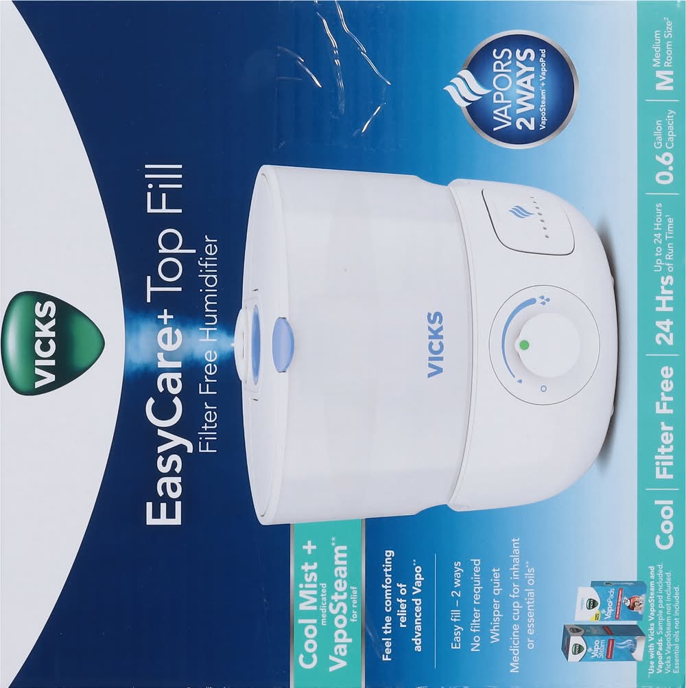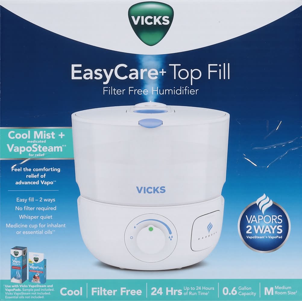 Your Vicks Easycare+ Top Fill Filter-Free Cool Mist Humidifier 0.6 Gal delivery options may vary depending on where you are in a city. Enter your address to browse Vicks Easycare+ Top Fill Filter-Free Cool Mist Humidifier 0.6 Gal delivery options near you.