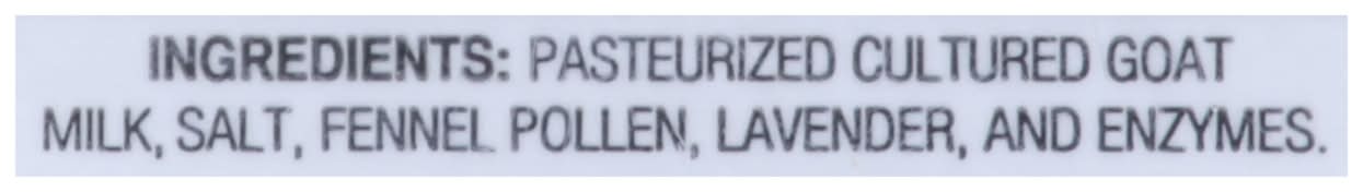 Pasteurized Cultured Goat Milk, Salt, Fennel Pollen, Lavender, and Enzymes Contains: Milk Additives: None