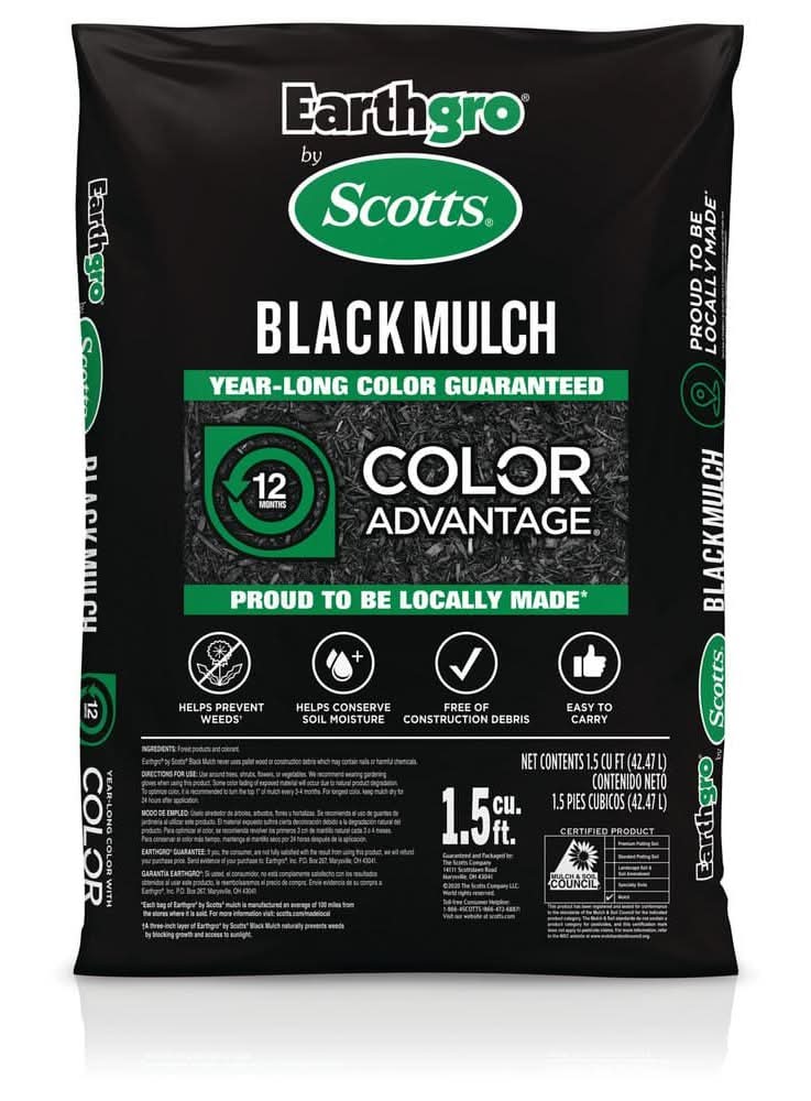Beautify your landscape with Earthgro by Scotts Black Mulch. Our bagged mulch uses Scotts Color Advantage to provide year-long color. Made from forest products, this shredded wood mulch helps conserve soil moisture while also preventing weeds by blocking growth and access to sunlight when applied at a 3-inch depth. Plus, this landscape mulch is free from construction debris and is locally made*. Use this colored mulch around trees, shrubs, flowers, or vegetables in gardens and landscapes. Some color fading of exposed material will occur due to natural product degradation. For longest color, keep mulch dry for 24 hours after application. To optimize color, it is recommended to turn or rake the top 1" of mulch every 3-4 months. One 1.5 cu. ft. bag of Earthgro by Scotts Black Mulch covers approximately 6 sq. ft. *Each bag of Earthgro by Scotts mulch is manufactured an average of 100 miles from the stores where it is sold. • Color: Black • Size: 1.5 cu ft