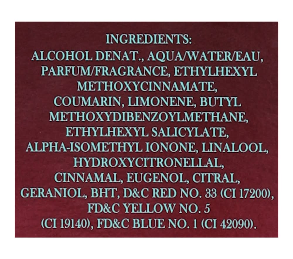 Ingredients: Alcohol Denat, Aqua/Water/Eau, Parfum/Fragrance, Ethylhexyl Methoxycinnamate, Coumarin, Limonene, Butyl Methoxydibenzoylmethane, Ethylhexyl Salicylate, Alpha-Isomethyl Ionone, Linalool, Hydroxycitronellal, Cinnamal, Eugenol, Citral, Geraniol, BHT, D&C Red 33 (CI 17200), FD&C Yellow 5 (CI 19140), FD&C Blue 1 (CI 42090)