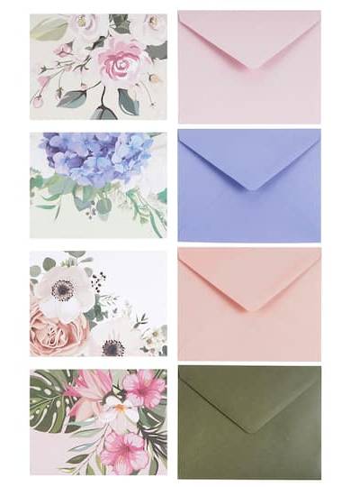 Use these lovely floral cards and envelopes to send seasonal greetings or thank you notes to your dear ones. Multicolour . A2 . 40 sets . Paper. 40 flat cards (4.25" x 5.5" / 10.7cm x 13.9cm) 40 envelope (4.5" x 5.75" / 11.4cm x 14.6cm).
