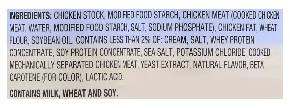 Chicken Stock, Modified Food Starch, Chicken Meat (Cooked Chicken Meat, Water, Modified Food Starch, Salt, Sodium Phosphate), Chicken Fat, Wheat Flour, Soybean Oil, Contains Less than 2% of: Cream, Salt, Whey Protein Concentrate, Soy Protein Concentrate, Sea Salt, Potassium Chloride, Cooked Mechanically Separated Chicken Meat, Yeast Extract, Natural Flavor, Beta Carotene (for Color), Lactic Acid Contains: Wheat, Soybeans Additives: None