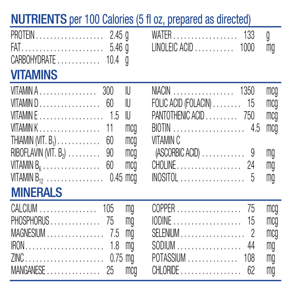 Directions for use: Use as directed by a doctor. Directions for Preparation and Use: Your baby’s health depends on carefully following these directions. Proper hygiene, handling and storage are important when preparing infant formula. Failure to follow these directions could result in severe harm. Ask your baby’s doctor if you need to use cooled, boiled water for mixing and if you need to boil (sterilize) bottles, nipples and rings before use. Wash your hands, surfaces and utensils. Pour water into clean bottle (see mixing guide). Add 1 unpacked level scoop (8.8 g) to each 2 fl oz water. Return dry scoop to can. Can bottle; shake well; attach clean nipple. Once feeding begins, use within 1 hour or discard. Mixing Guide: Measure water: 2 fl oz + Add scoop(s) of unpacked level powder using enclosed scoop: 1 scoop (8.8 g) = Finished bottle (approx.): 2 fl oz. Measure water: 4 fl oz + Add scoop(s) of unpacked level powder using enclosed scoop: 2 scoops = Finished bottle (approx.): 4 fl oz. Measure water: 6 fl oz + Add scoop(s) of unpacked level powder using enclosed scoop: 3 scoops = Finished bottle (approx.): 6 fl oz. Measure water: 8 fl oz + Add scoop(s) of unpacked level powder using enclosed scoop: 4 scoops = Finished bottle (approx.): 8 fl oz. Similac: 1 can = 4 fl oz: 22 bottles. When mixed as directed, makes approx. 90 fl oz of formula. 0-12 months Storage: Once mixed, store bottles in refrigerator and feed to baby with in 24 hours. Store unopened or opened container at room temperature; avoid extreme temperatures. Use opened can contents within 1 month. Use by date on can. Storage recommendation: Once mixed, store bottles in refrigerator and feed to baby with in 24 hours. Store unopened or opened container at room temperature; avoid extreme temperatures. Use opened can contents within 1 month.