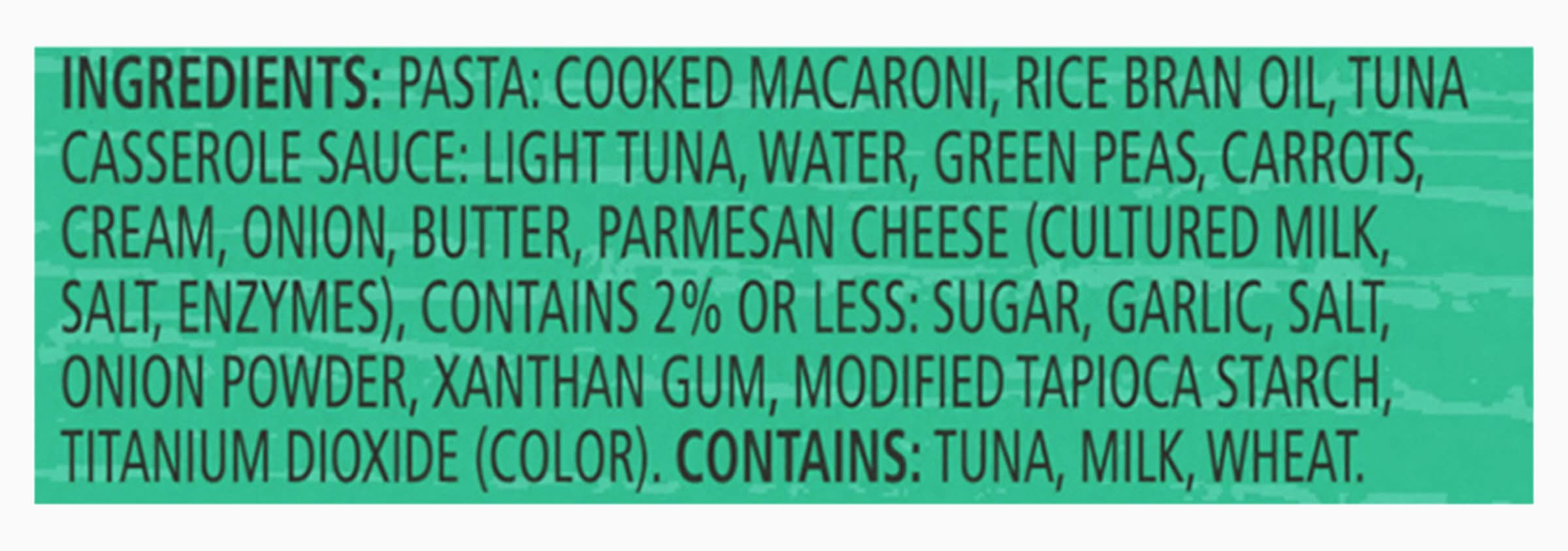 Pasta: Cooked Macaroni, Rice Bran Oil, Tuna Casserole Sauce: Light Tuna, Water, Green Peas, Carrots, Cream, Onion, Butter, Parmesan Cheese (Cultured Milk, Salt, Enzymes), Contains 2% or Less: Sugar, Garlic, Salt, Onion Powder, Xanthan Gum, Modified Tapioca Starch, Titanium Dioxide (Color) Contains: Fish, Tuna, Milk, Wheat