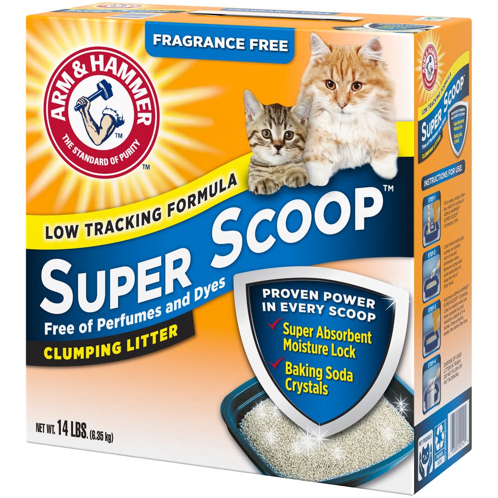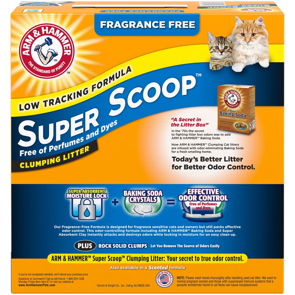 Arm & Hammer Super Scoop Clumping Litter is a fragrance-free cat litter designed for both fragrance-sensitive cats and their owners. It contains odor-eliminating baking soda, which, combined with super absorbent clay, provides effective odor control. This formula instantly neutralizes odors and locks in moisture, facilitating an easy cleanup. It forms rock-solid clumps, allowing for the easy removal of the source of odors. The product is also low tracking, minimizing litter spread outside the box. Made in the USA with domestic and foreign ingredients, it is pet-friendly and suitable for maintaining a fresh-smelling home. Packaging: Reusable
