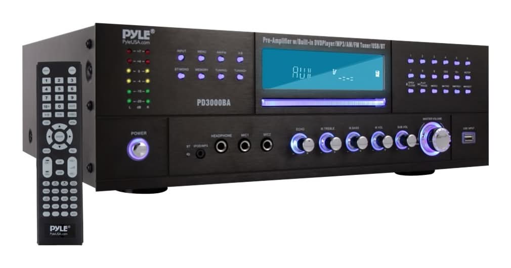 The Pyle Home Theater Receiver provides versatile audio and video entertainment. High-Powered stereo preamplifier performance comes loaded with audio playback features including front-loading CD/DVD player, AM/FM radio, USB & SD flash memory readers, aux (3.5mm) input and two 1/4'' -inch microphone inputs. Connect external surround sound speakers to create a cinema-style media experience in your living room. Bluetooth wireless receiver ability is compatible with all of today's latest devices and features hassle-free setup for instant music streaming. Get connected to your entire home theater system including the TV, DVD player, soundbar, subwoofers and multi-channel speakers for full-ranged pro audio stereo sound enjoyment. Rear panel connector types include speaker terminal binding posts, RCA audio inputs, dedicated subwoofer output, digital optical audio output, component S-video connector - along with a headphone jack for private listening. MP3 digital audio file support allows you to playback your entire digital media file library while you configure your sound via the front panel button control center. Enjoy versatile audio entertainment ability with the Pyle Bluetooth Home Theater Stereo Receiver System. Pyle Audio,
