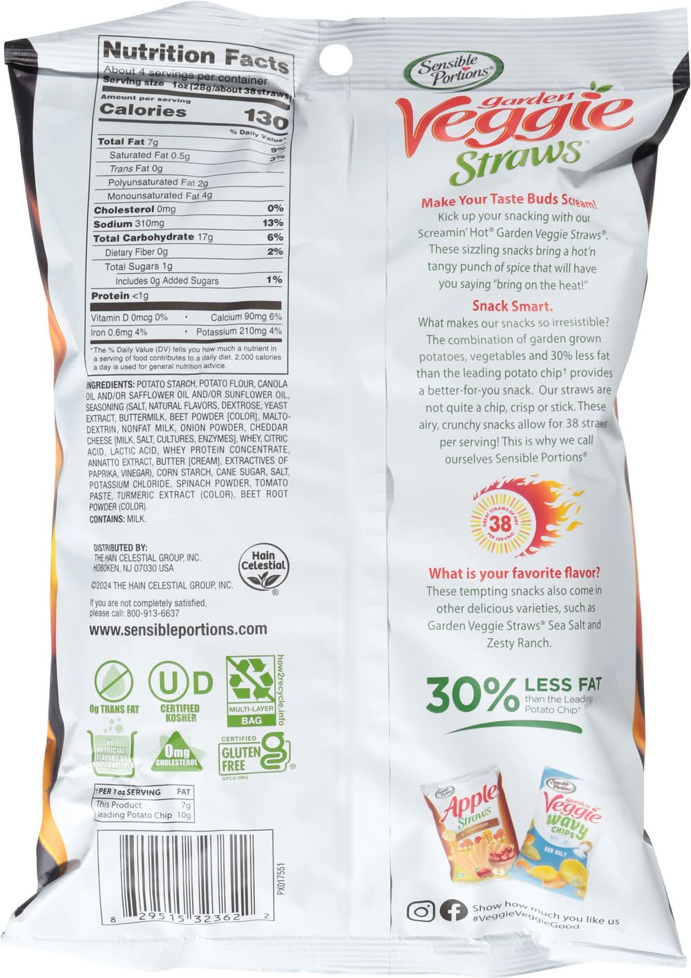 30% less fat than the leading potato chips (Per 1 Oz Serving: 7 g fat this product; 10 g fat leading potato chip). 0 mg cholesterol. 0 g trans fat. Gluten Free,Kosher,No Artificial Flavors,No Artificial Preservatives,Non GMO Screamin Hot Flavor Vegetable & Potato Snack Flavor: Screamin' hot