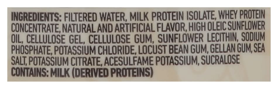 Filtered Water, Milk Protein Isolate, Whey Protein Concentrate, Natural and Artificial Flavor, High Oleic Sunflower Oil, Cellulose Gel, Cellulose Gum, Sunflower Lecithin, Sodium Phosphate, Potassium Chloride, Locust Bean Gum, Gellan Gum, Sea Salt, Potassium Citrate, Acesulfame Potassium, Sucraiose Contains: Milk
