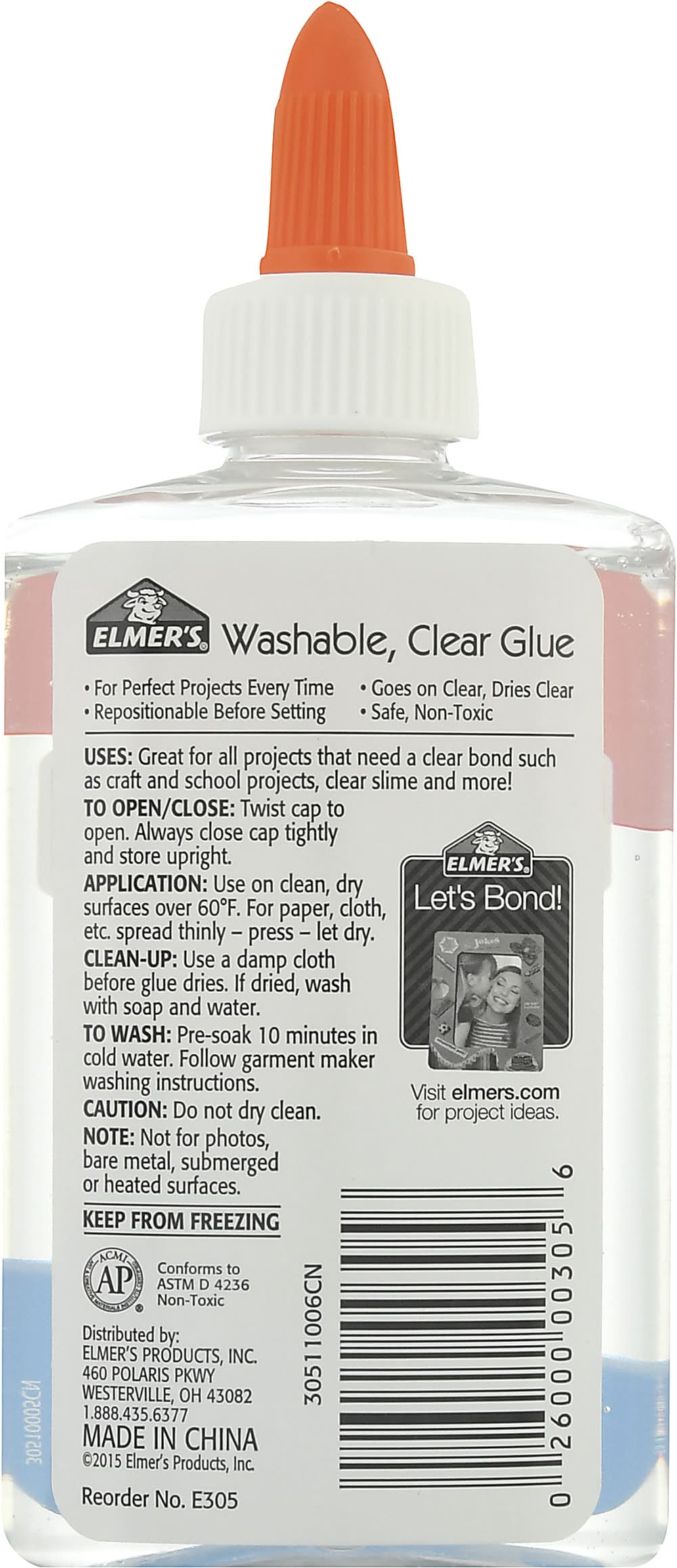 Glue, Clear, Washable • Elmer's Products, Inc., 460 Polaris Pkwy,Westerville,OH,43082 • Packaging: Reusable