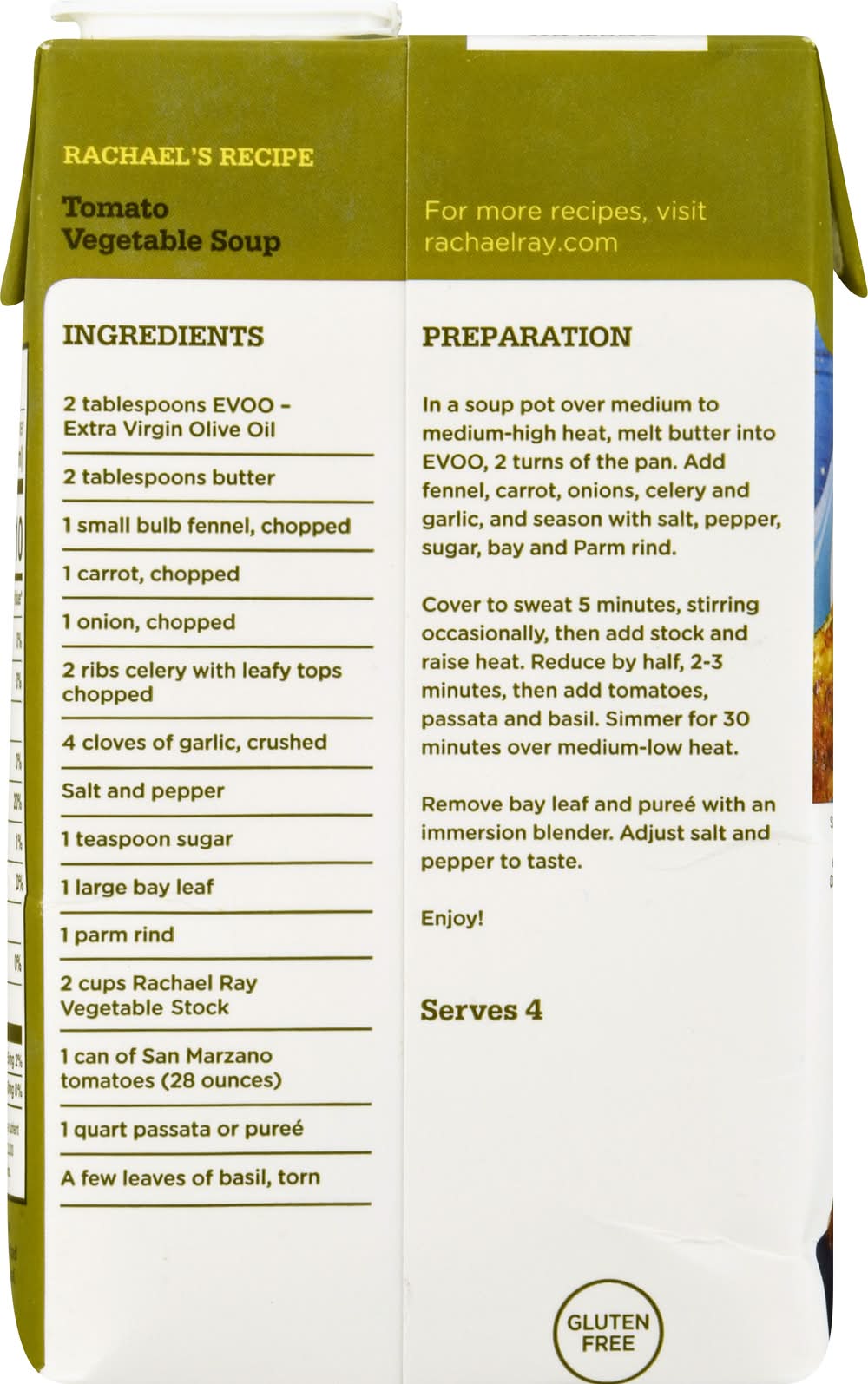 Directions for use: Directions: In a soup pot over medium to medium-high heat, melt butter into evoo, 2 turns of the pan. Add fennel, carrot, onions, celery and garlic, and season with salt, pepper, sugar, bay and parm rind. Cover to sweat 5 minutes, stirring occasionally, then add stock and raise heat. Reduce by half, 2-3 minutes, then add tomatoes, passata and basil. Simmer for 30 minutes over medium-low heat. Remove bay leaf and puree with an immersion blender. Adjust salt and pepper to taste. Enjoy. Serves 4. Store unopened carton at room temperature. After opening, refrigerate promptly after each use and use within 14 days. Do not dilute. Do not microwave in carton. Recommended use by date on carton. Storage recommendation: After opening, refrigerate promptly after each use and use within 14 days. Do not dilute. Do not microwave in carton. Recommended use by date on carton.