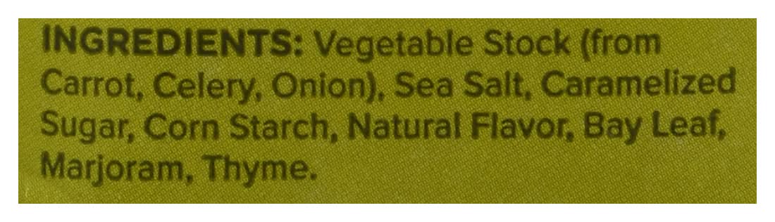 Vegetable Stock (from Carrot, Celery, Onion), Sea Salt, Caramelized Sugar, Corn Starch, Natural Flavor, Bay Leaf, Marjoram, Thyme