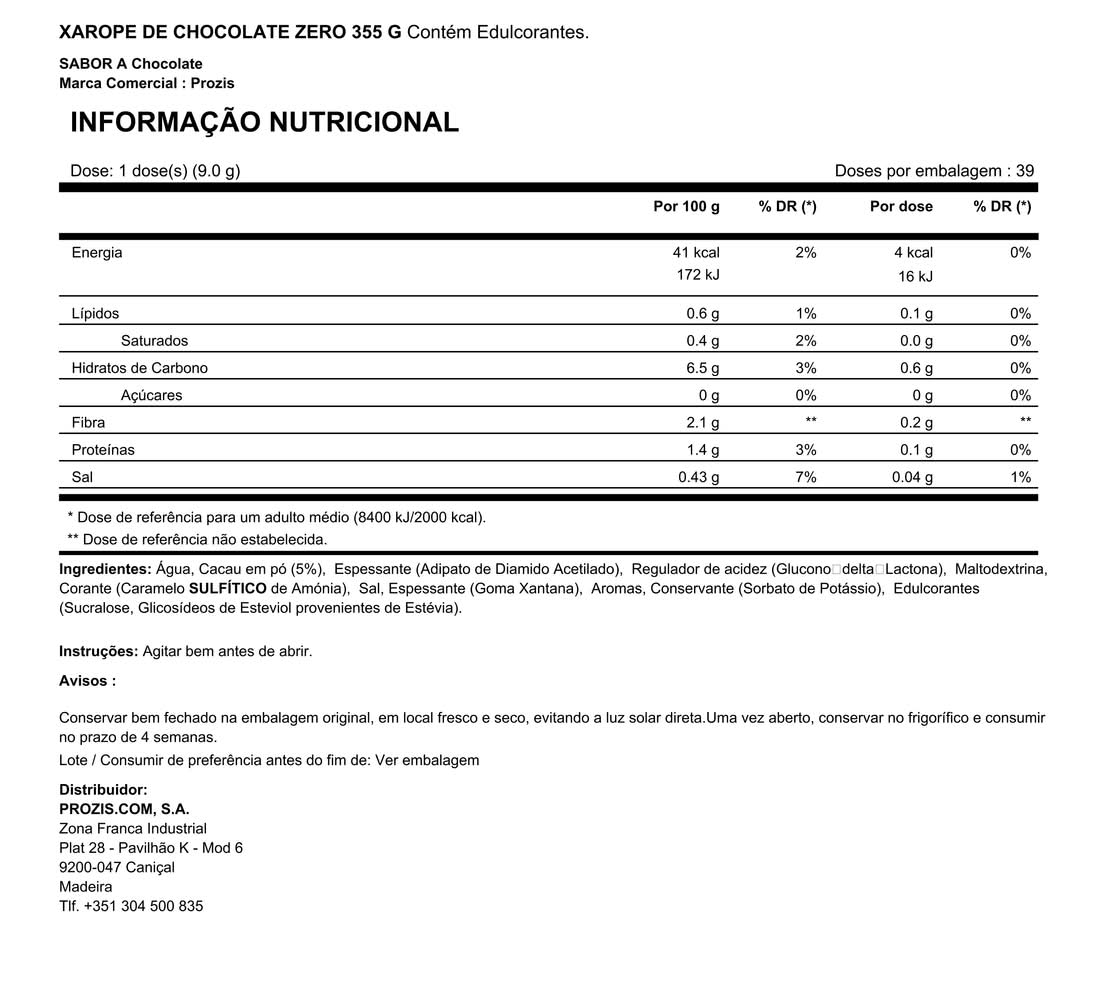 Xarope de Chocolate Zero 355 g Chocolate PROZIS.COM, S.A., Zona Franca Industrial,Plataforma 28,Pavilhão K,M6 9200-047, Caniçal, Machico - Madeira, Portugal