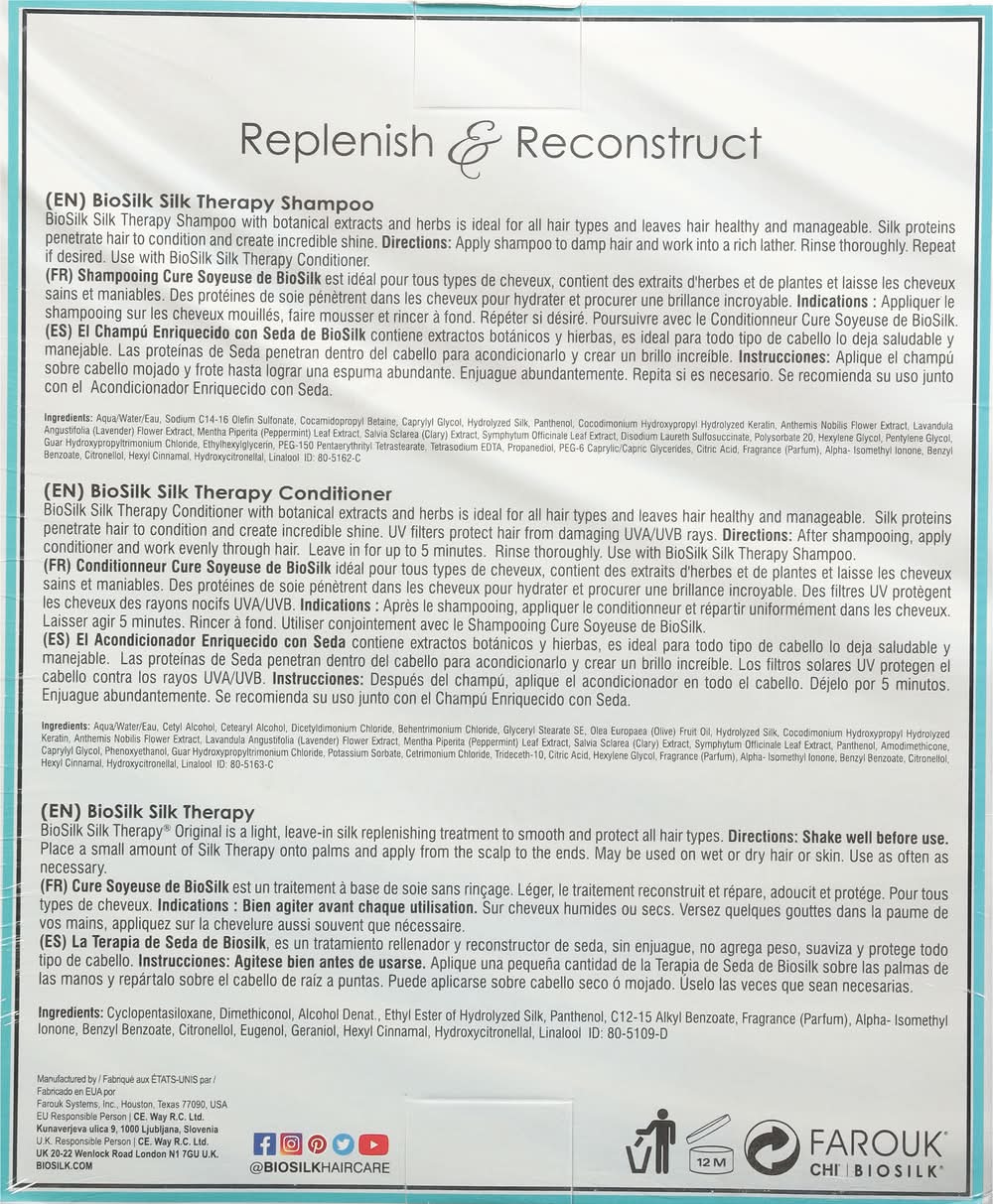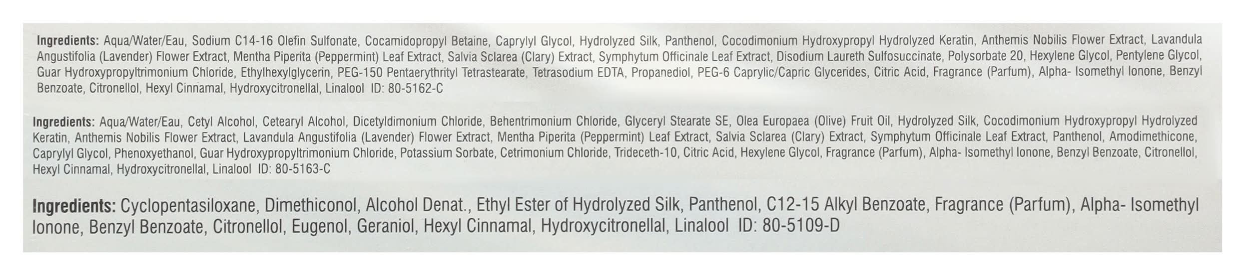 Ingredients: BioSilk Silk Therapy Conditioner: Aqua/Water/Eau, Cetyl Alcohol, Cetearyl Alcohol, Dicetyldimonium Chloride, Behentrimonium Chloride, Glyceryl Stearate SE, Olea Europaea (Olive) Fruit Oil, Hydrolyzed Silk, Cocodimonium Hydroxypropyl Hydrolyzed Keratin, Anthemis Nobilis Flower Extract, Lavandula Angustifolia (Lavender) Flower Extract, Mentha Piperita (Peppermint) Leaf Extract, Salvia Sclarea (Clary) Extract, Symphytum Officinale Leaf Extract, Panthenol, Amodimethicone, Caprylyl Glycol, Phenoxyethanol, Guar Hydroxypropyltrimonium Chloride, Potassium Sorbate, Cetrimonium Chloride, Trideceth-10, Citric Acid, Hexylene Glycol, Fragrance (Parfum), Alpha-Isomethyl Ionone, Benzyl Benzoate, Citronellol, Hexyl Cinnamal, Hydroxycitronellal, Linalool. BioSilk Silk Therapy : Cyclopentasiloxane, Dimethiconol, Alcohol Denat, Ethyl Ester of Hydrolyzed Silk, Panthenol, C12-15 Alkyl Benzoate, Fragrance (Parfum), Alpha-Isomethyl Lonone, Benzyl Benzoate, Citronellol, Eugenol, Geraniol, Hexyl Cinnamal, Hydroxycitronellal, Linalool. BioSilk Silk Therapy Shampoo : Aqua/Water/Eau, Sodium C14-16 Olefin Sulfonate, Cocamidopropyl Betaine, Caprylyl Glycol, Hydrolyzed Silk, Panthenol, Cocodimonium Hydroxypropyl Hydrolyzed Keratin, Anthemis Nobilis Flower Extract, Lavandula Angustifolia (Lavender) Flower Extract, Mentha Piperita (Peppermint) Leaf Extract, Salvia Sclarea (Clary) Extract, Symphytum Officinale Leaf Extract, Disodium Laureth Sulfosuccinate, Polysorbate 20, Hexylene Glycol, Pentylene Glycol, Guar Hydroxypropyltrimonium Chloride, Ethylhexylglycerin, PEG-150 Pentaerythrityl Tetrastearate, Tetrasodium EDTA, Propanediol, PEG-6 Caprylic/Capric Glycerides, Citric Acid, Fragrance (Parfum), Alpha-Isomethyl Ionone, Benzyl Benzoate, Citronellol, Hexyl Cinnamal, Hydroxycitronellal, Linalool. ID: 80-5163-C. ID: 80-5109-D. ID: 80-5162-C