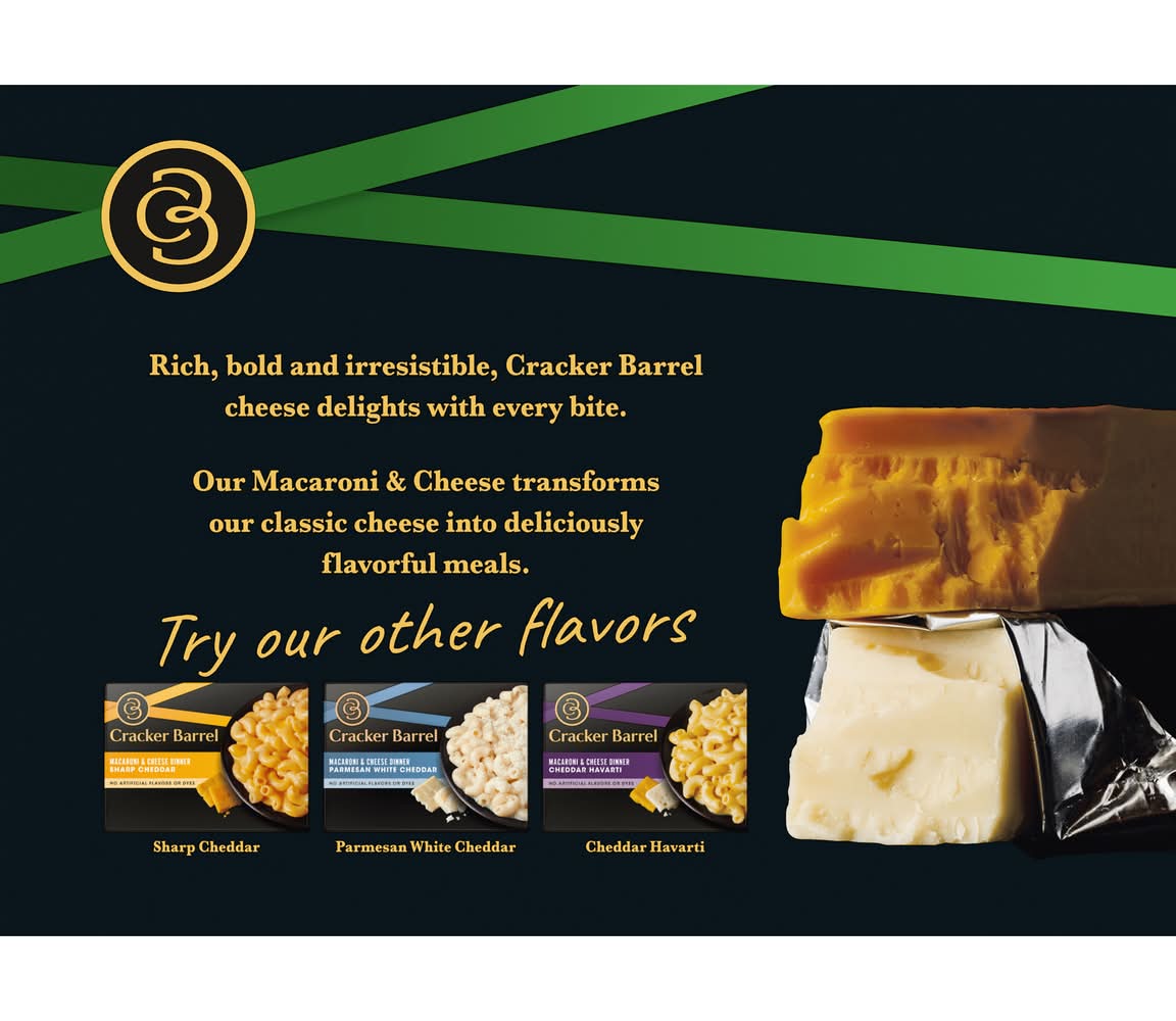 Your Cracker Barrel Sharp White Cheddar Macaroni & Cheese Dinner delivery options may vary depending on where you are in a city. Enter your address to browse Cracker Barrel Sharp White Cheddar Macaroni & Cheese Dinner delivery options near you.