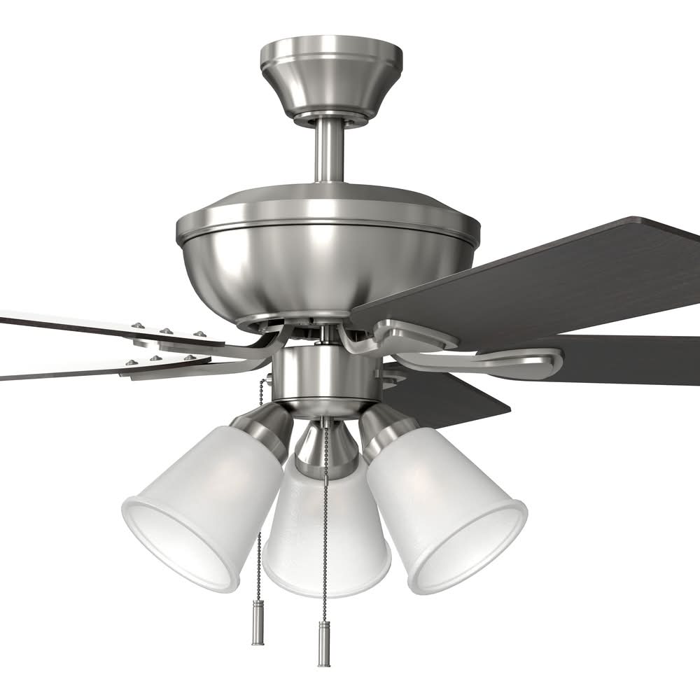 Features a light kit with three 5.5W LED medium base light bulbs.. Only suitable for indoor locations.. At 52-in diameter, this fan is ideal for large rooms up to 400-sq ft.. Includes convenient pull chains to control fan speed and light.. Tri-mount installation for downrod use with flat or angled ceilings (4.5-in downrod included) or use without downrod for lower ceilings.. Reversible motor allows for changing the fan direction seasonally to push cool air down in the summer, or distribute warm air evenly in the winter.. Reversible blades to match your style in any room.. This fan provides a CFM of 4201 on high speed.. Uses replacement glass shade under Lowe's item number 4664691.. Use Location: Indoor For CA Residents Only: WARNING: This product can expose you to chemicals including Lead which are known to the State of California to cause cancer and birth defects or other reproductive harm. For more information go to www.P65Warnings.ca.gov. Color: No