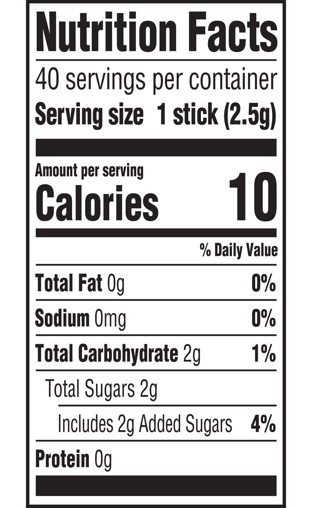 Ingredients: Sugar, Gum Base, Corn Syrup; Less than 2% of: Glycerol, Natural Flavors, Sorbitol, Soy Lecithin, Aspartame, Acesulfame K, BHT (to Maintain Freshness).