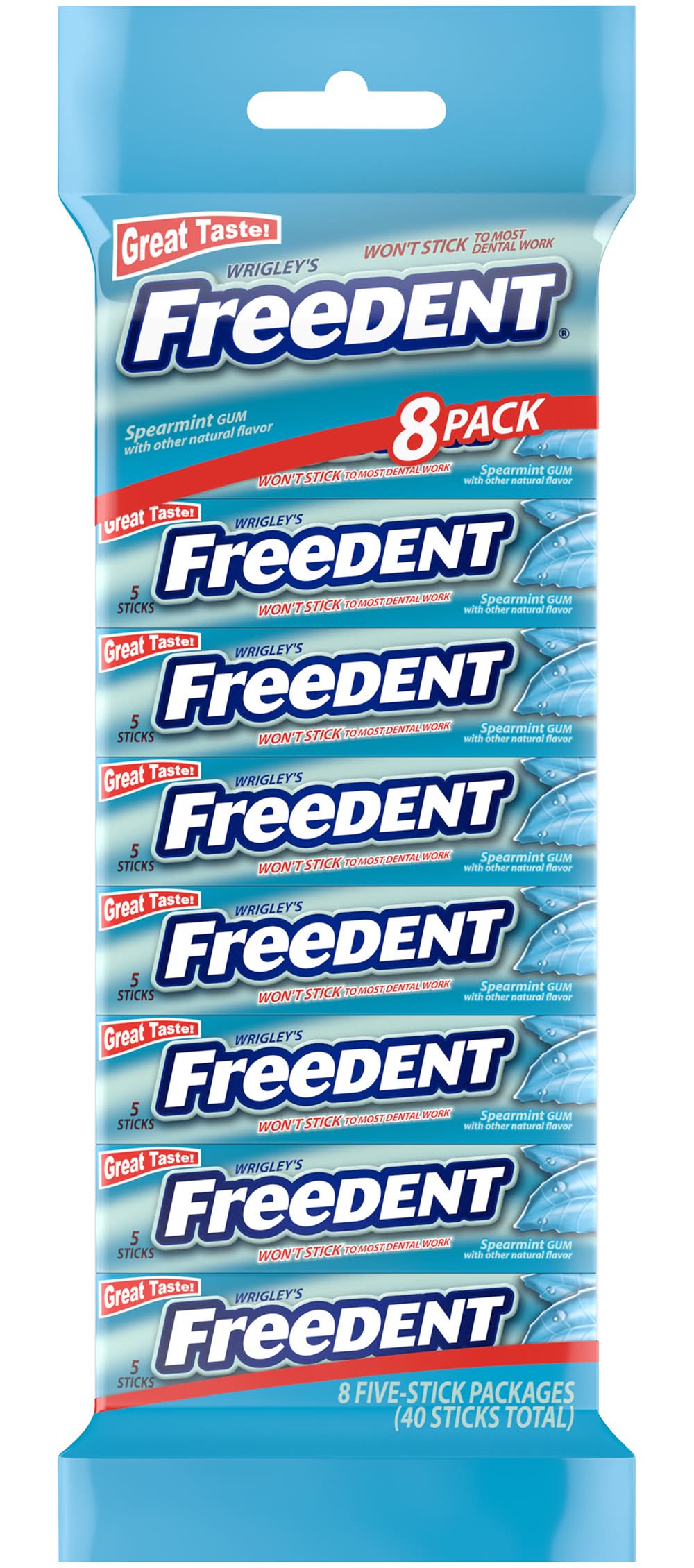 Freedent Spearmint Gum is a spearmint-flavored chewing gum designed to provide breath freshening benefits. It offers a smooth chewing experience and is formulated not to adhere to dental work. Enjoy the refreshing taste of spearmint with each stick. Number of servings: 40