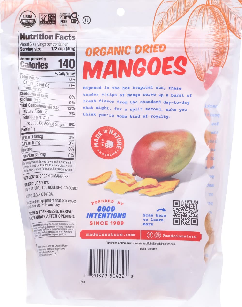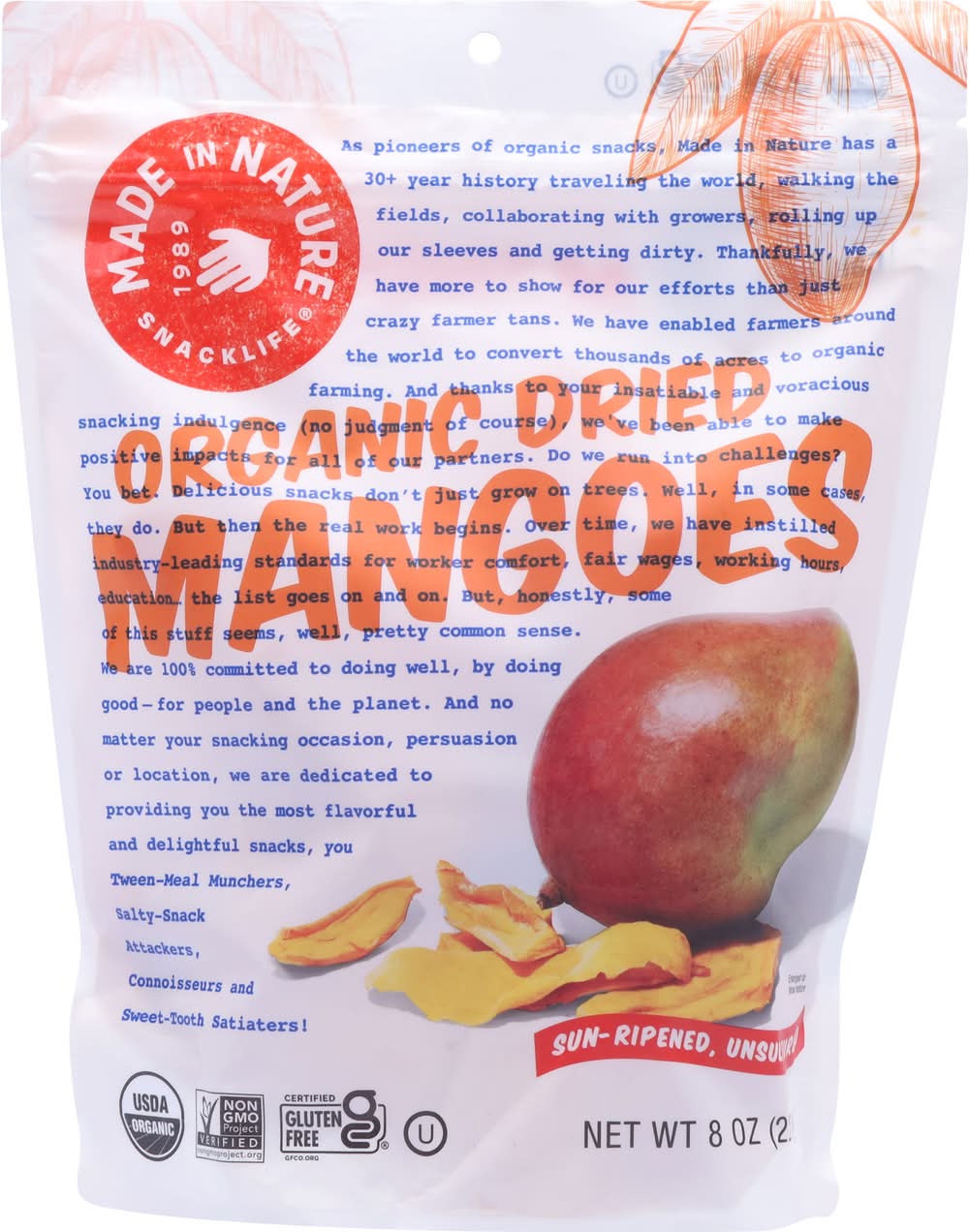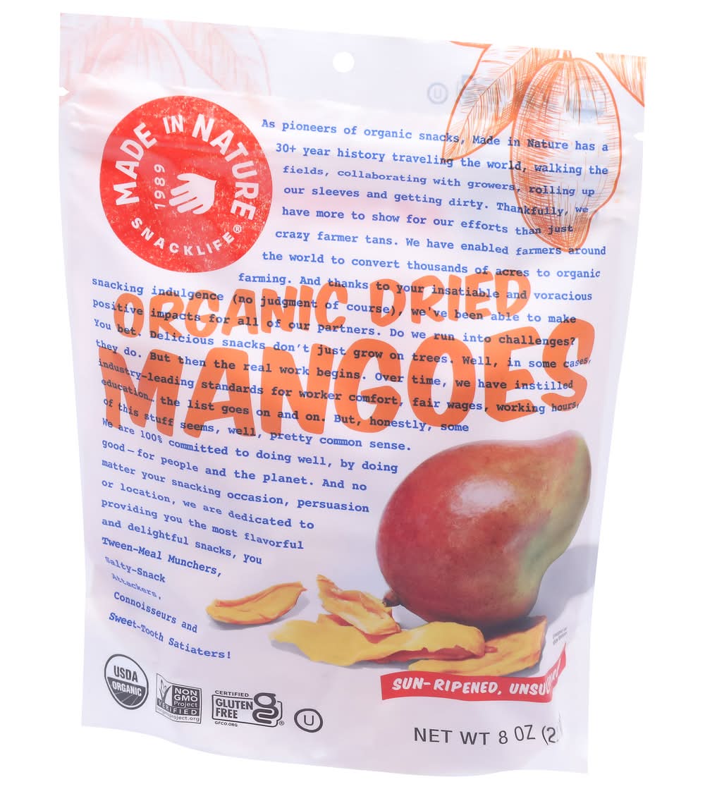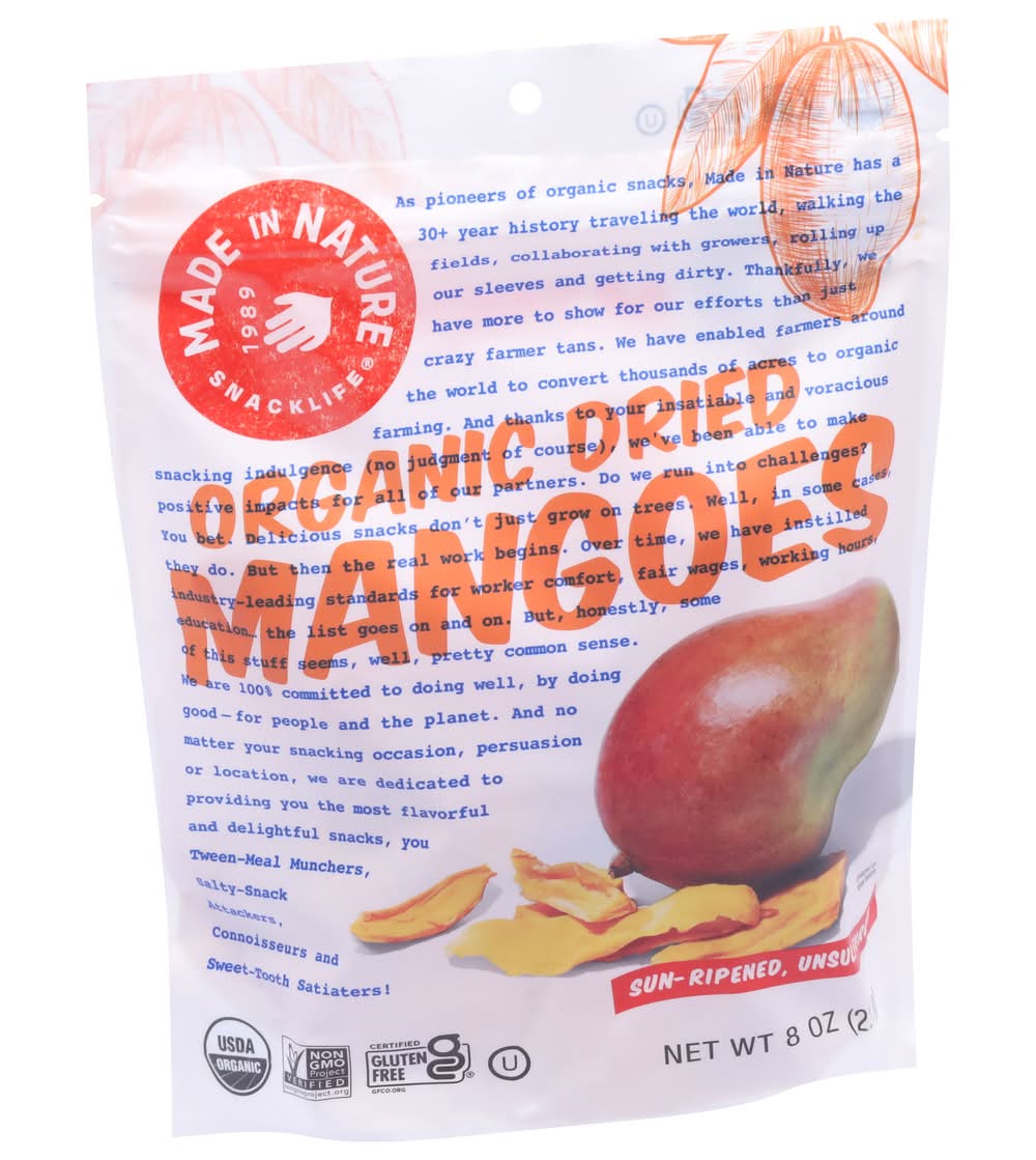 USDA Organic. Certified gluten free. Certified Organic by QAI. Non-GMO Project verified. 1989. As pioneers of organic snacks, has a 30+ year history traveling the world, walking the fields, collaborating with growers, rolling up our sleeves and getting dirty. Thankfully, we have more to show for our efforts than just crazy farmer tans. We have enabled farmers around the world to convert thousands of acres to . And thanks to your insatiable and voracious snacking indulgence (no judgment of course), we've been able to make positive impacts for all of our partners. Do we run into challenges? they do. But then the real work begins. Over time, we have instilled industry-leading standards for worker comfort, fair wages, working hours, education the list goes on and on. But, honestly, some of this stuff seems, well, pretty common sense. We are 100% committed to doing well, by doing good- for people and the planet. And no matter your snacking occasion, persuasion or location, we are dedicated to providing you the most and delightful snacks, you tween-meal munchers, salty-stack-attackers, connoisseurs and sweet-tooth ! Sun-ripened, unsulfured. Ripened in the hot tropical sun, these tender strips of mango serve up a burst of fresh flavor from the standard day-to-day that might, for a split second, make you think you're some kind of royalty. Powered by good intentions since Made In Nature, LLC, Boulder CO80302